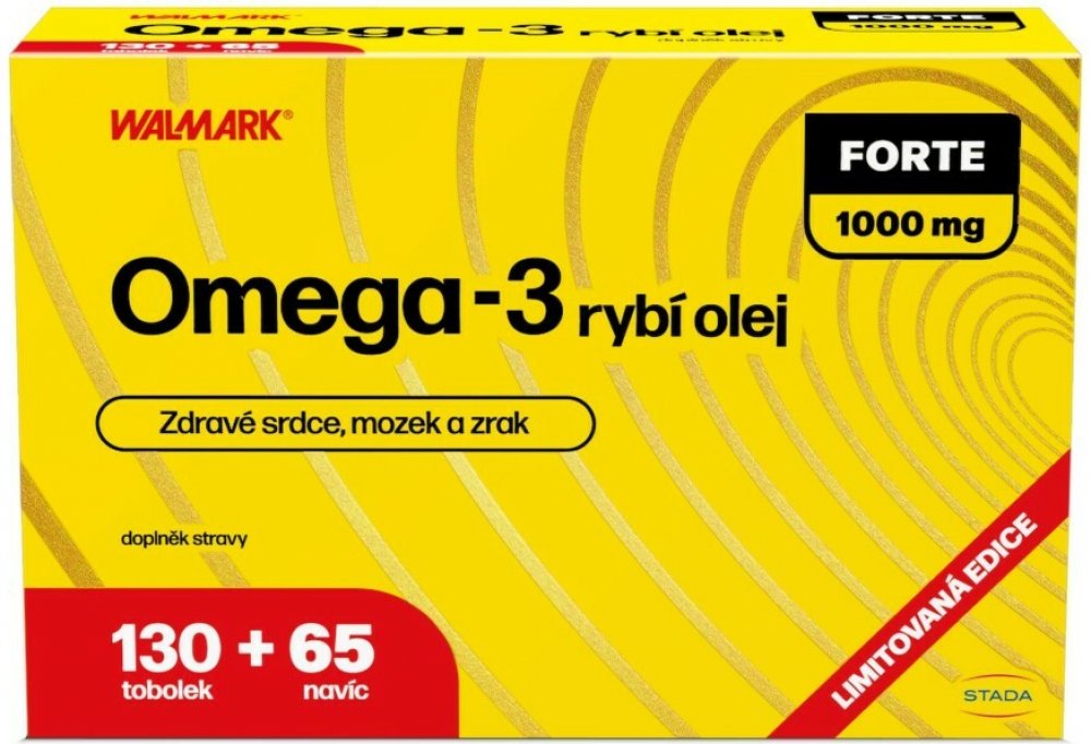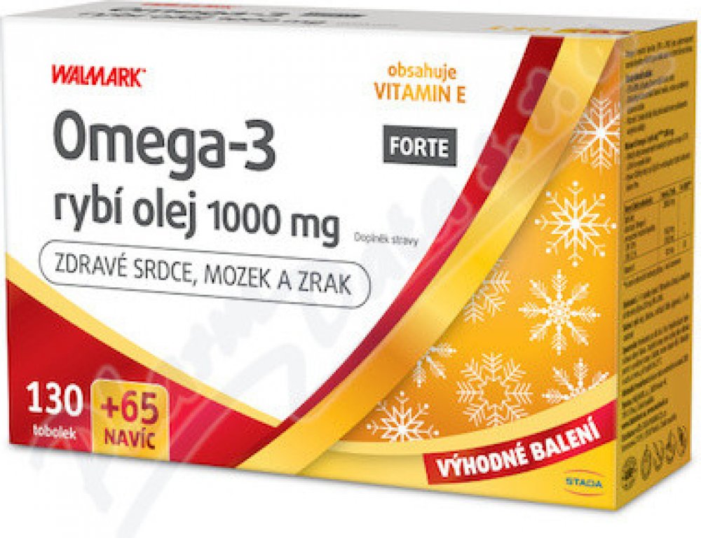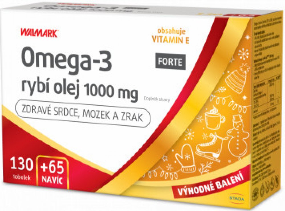 Doplněk stravy Walmark Omega 3 Rybí olej Forte obsahuje vysokou dávku omega-3 nenasycených mastných kyselin (EPA, DHA) prémiové kvality pro zdravé srdce, mozek a zrak. Snadno polykatelné tobolky nezanechávají v ústech nepříjemnou rybí pachuť. Nyní v limitované vánoční edici výhodné balení minimálně na 3 měsíce (130 + 65 tobolek zdarma).