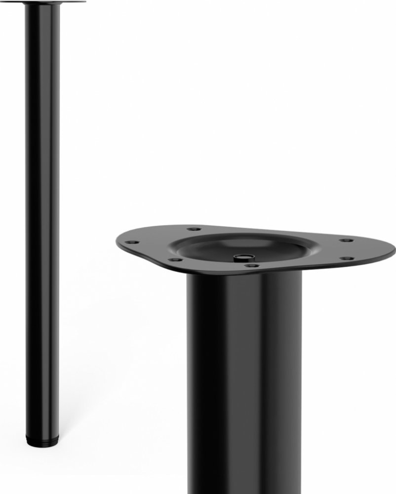 Kulatá kovová nábytková noha v černé barvě o průměru 60 mm s robustní základnou a spodním stavitelným plastovým kluzákem. Pro vyrovnání nerovností podlahy má každá noha individuálně nastavitelné plastové zátky.