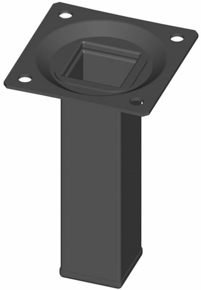 Hranatá kovová nábytková noha v černé barvě průřezu 25 x 25 mm s robustní základnou a spodním plastovým kluzákem. Možnost dokoupení volitelného nastavovacího šroubu se závitem M10, který kompenzuje možné nerovnosti podlahy.