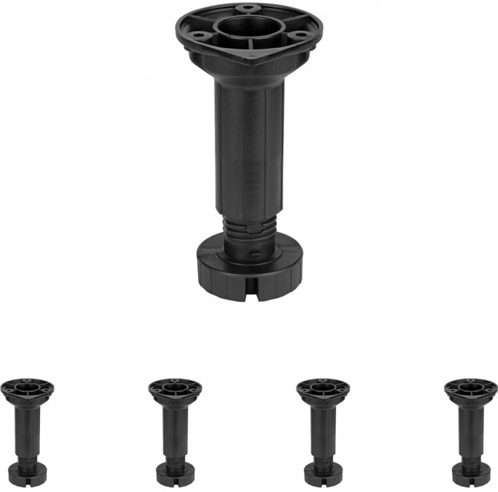 Plastová soklová noha s regulovatelnou výškou 96-150 mm v elegantním černém provedení je ideálním řešením pro vaše kuchyňské linky a další nábytkové projekty.