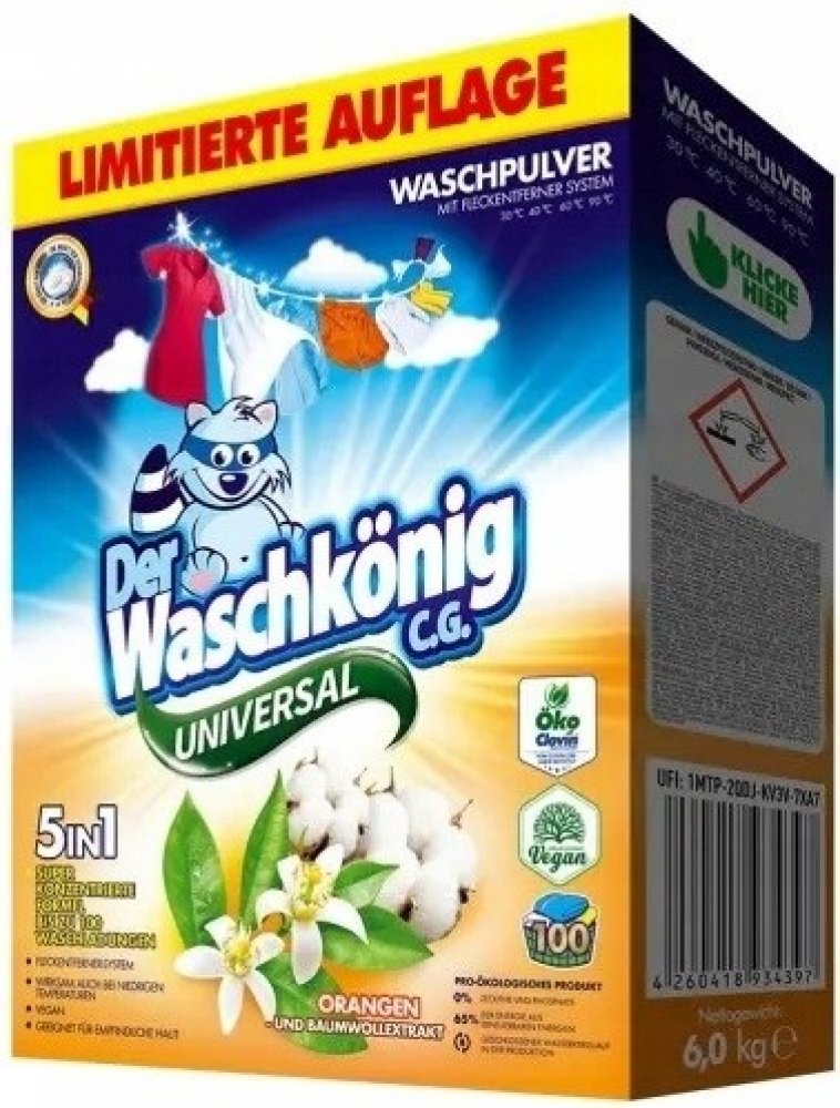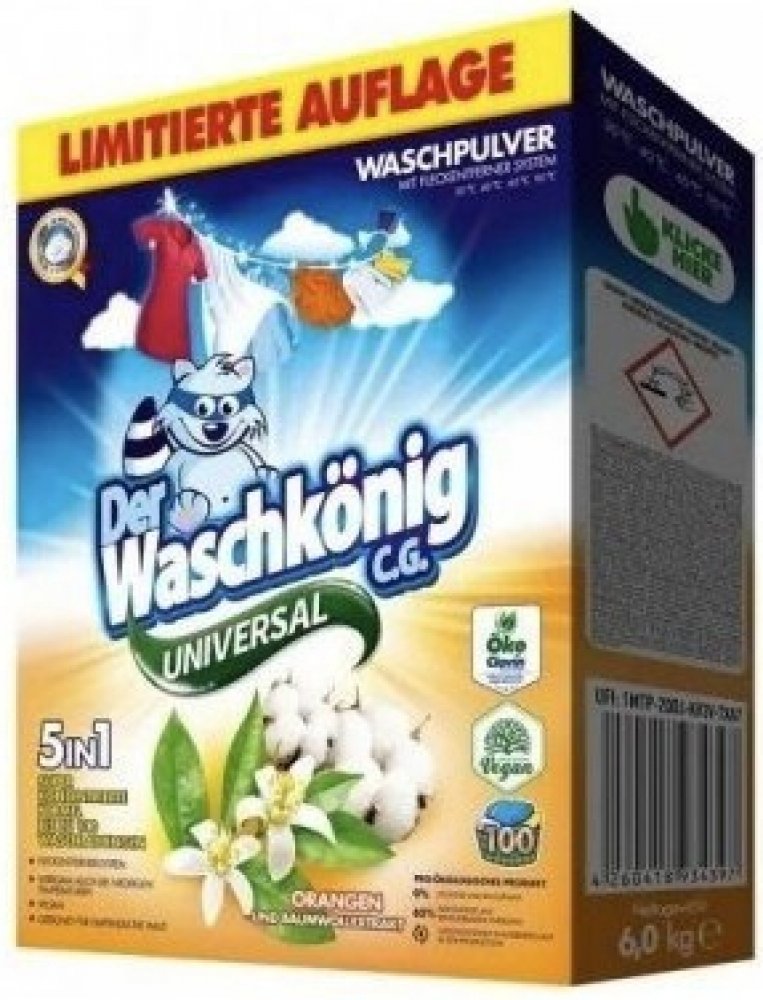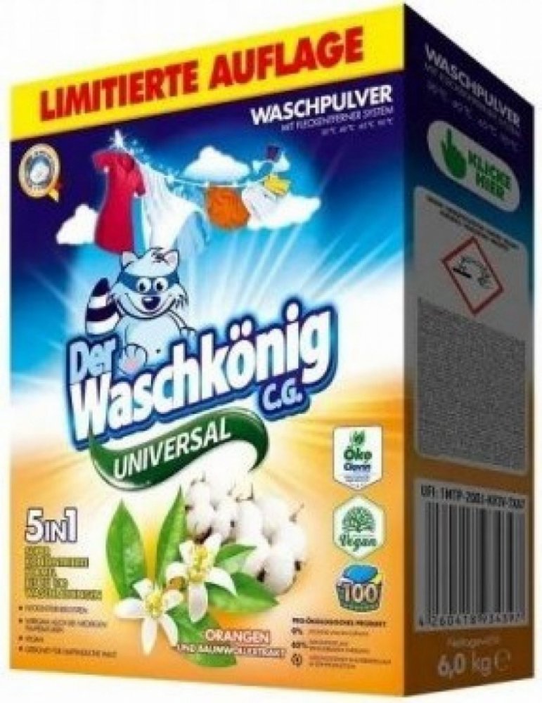 Der Waschkönig Universal Orange & Baumwolle XL - LIMITOVANÁ EDICE Velmi účinný německý prací prášek Der Waschkönig CG s kapacitou 6 kg s extraktem z pomeranče a bavlny pro praní prádla. Velmi účinný, vystačí na 100 praní. Vyznačuje se novou, intenzivní pomerančovou vůní. Velmi dobře se rozpouští ve vodě. Má vysokou schopnost odstraňovat skvrny a obnovovat barvu. Obsahuje hodně červených granulí. N...