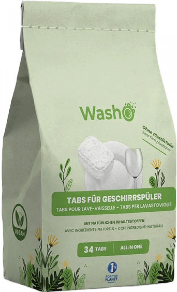 Tablety do myčky All in One - Přírodní složení, VEGAN, bez plastů 34 tablet á 20gTablety do myčky Washo jsou zcela bez plastů. Neobsahují krycí fólii na každé tabletě a jsou baleny v papírovém sáčku. Vyrobeny jsou čistě z přírodních látek bez využití složek živočišného původu. Tablety jsou určeny pro náročné zákazníky ve Švýcarsku.Kvalitní tablety do myčky VEGAN, bez plastů, které mají přírodní sl...