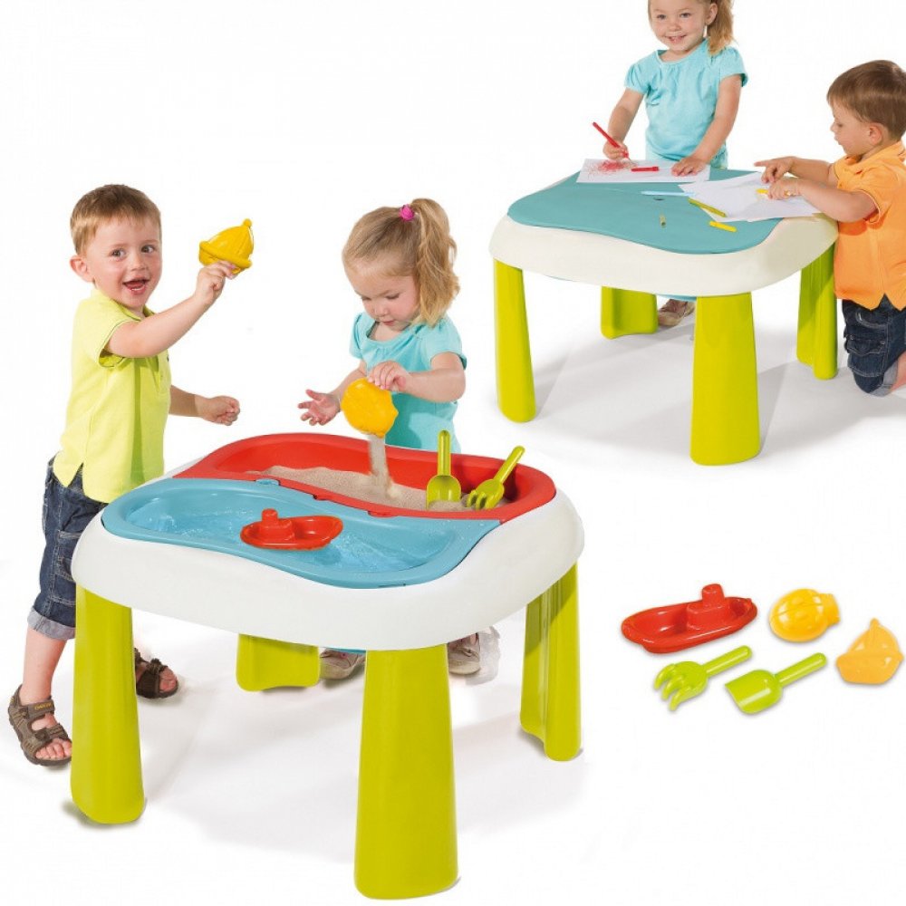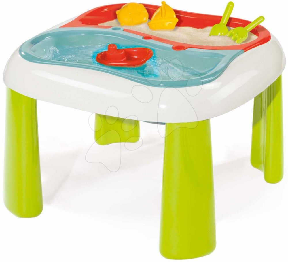 Součástí stolu jsou dva vyjímatelné boxy na písek a vodu, lodička, hrabičky, lopatička a 2 formičky na písek. Dodáváno i s ochranným víkem (2 části). Vhodný i do prostor s nedostatkem místa.