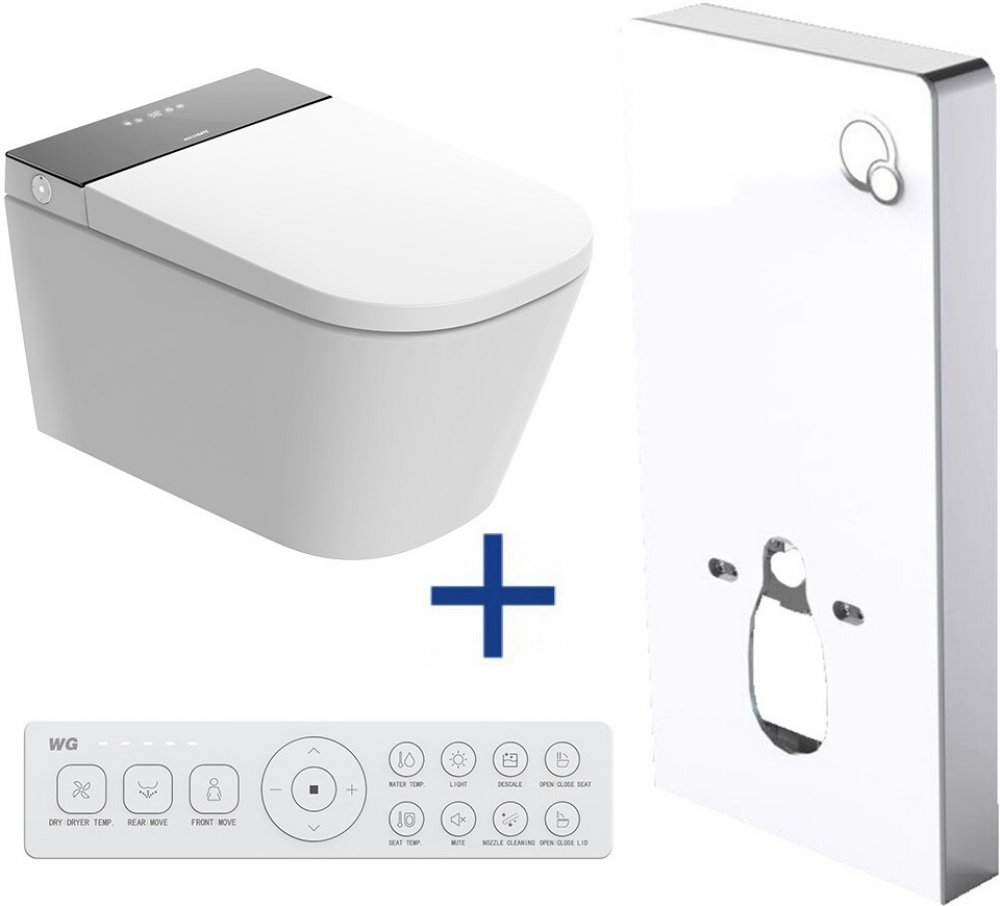 Designová elektronická sprchovací toaleta s dálkovým ovládáním zavěšená na samonosným 11 cm hlubokým WC modulu připevněným ke stěně. Nosnost 160 kg. Celková hloubka sestavy 69 cm. Rám WC modulu vyroben z vysoce kvalitního hliníku. Přední stranu tvoří 8 mm silné ESG tepelně tvrzené bezpečnostní sklo. Nádržka na vodu s plným i částečným tichým pneumatickým splachováním. Ovládací tlačítko již součástí balení.