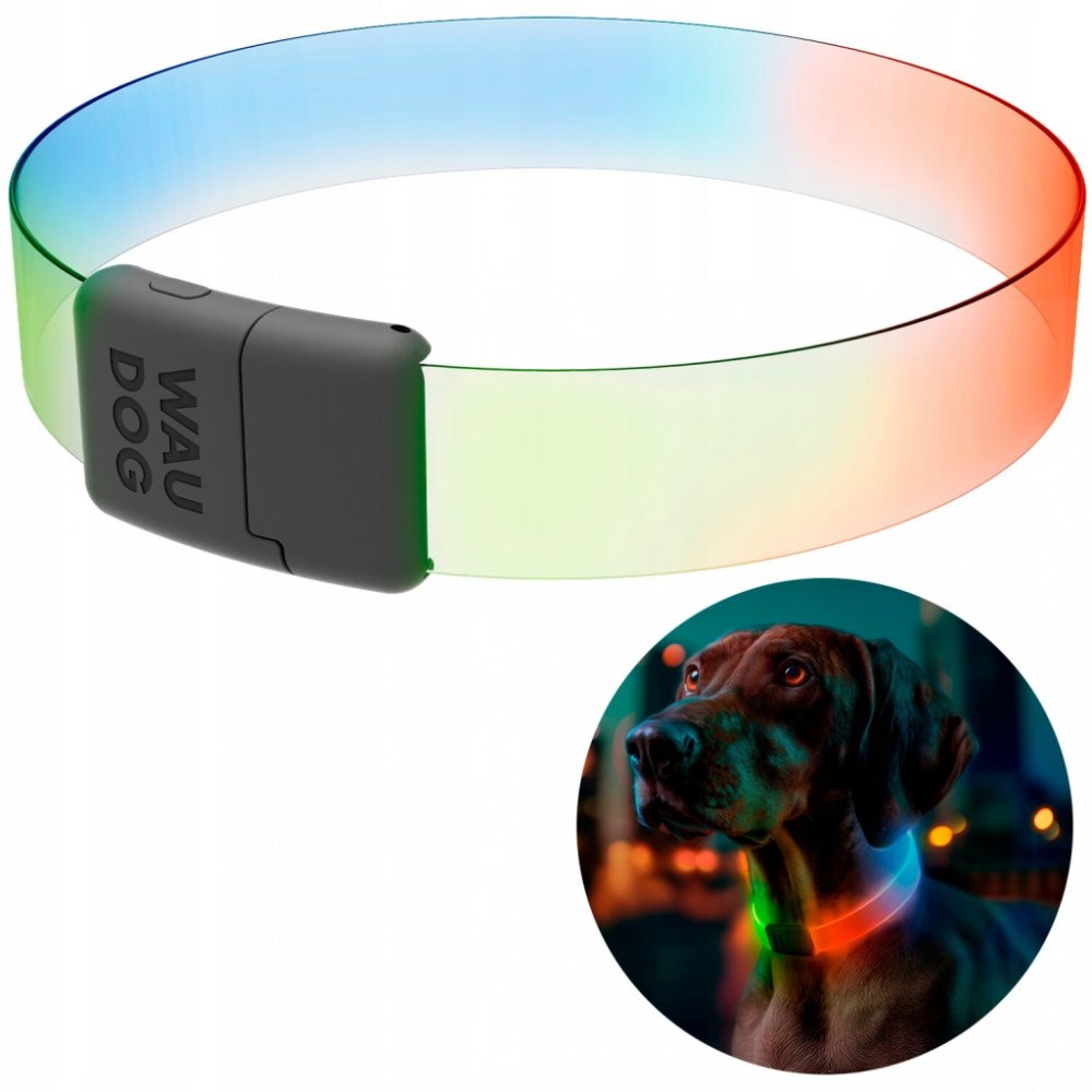 Moderní WAUDOG LED obojek je ideální doplněk pro všechny, kteří se se psem vydávají na večerní procházky. Průhledný, pružný pásek je rovnoměrně prosvícen LED světlem v barvách červené, modré a zelené – nebo v režimu plynulého přecházení všech odstínů.