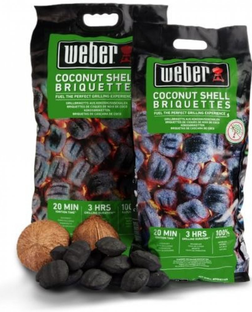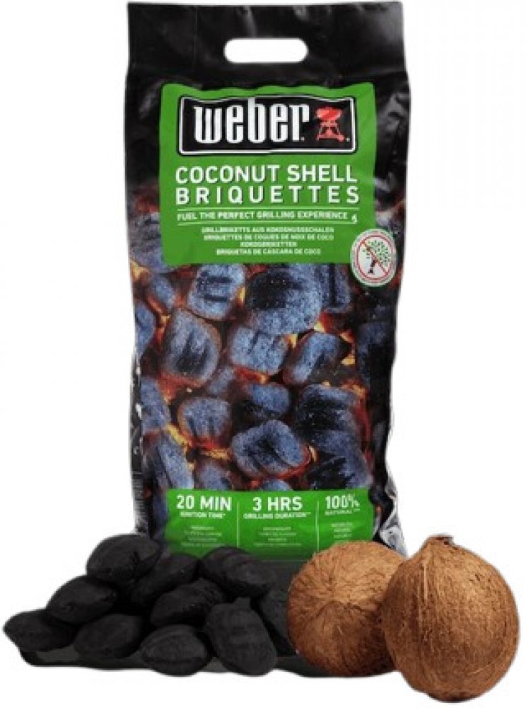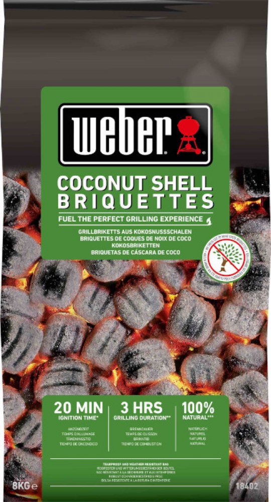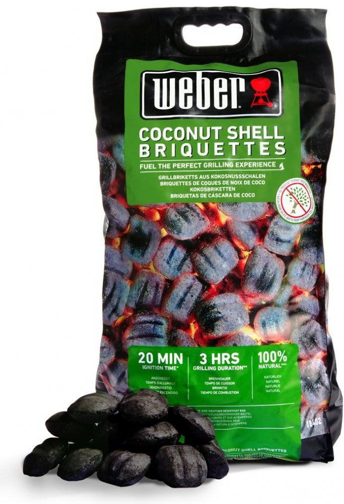 Brikety Weber z kokosových skořápek představují vysoce výkonnou variantu paliva a poskytují až 3 hodiny grilování. Kokosové brikety se rozpálí během 20 minut, takže můžete začít grilovat bez dlouhého čekání. Jsou vyrobeny ze 100% přírodního materiálu – karbonizovaných kokosových skořápek a tapiokového škrobu – a neobsahují žádné dřevo.