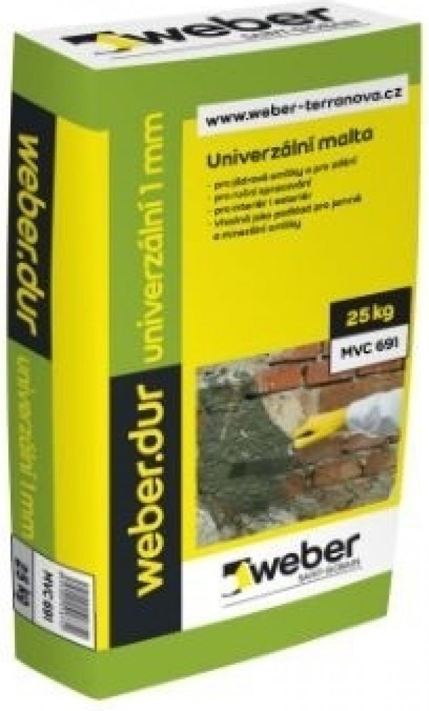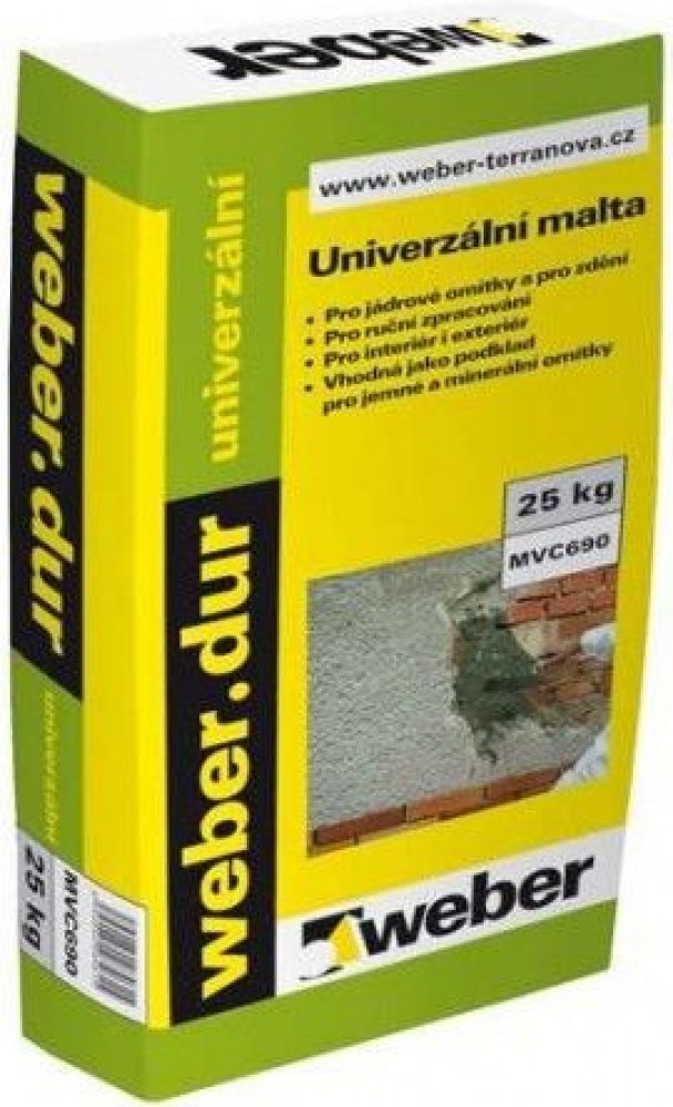 Weber dur univerzální je hmota na bázi anorganického plniva, pojiva a modifikujících přísad. Použití Jde o maltu na zdění a pro jádrové omítky. Tento produkt je určen k ručnímu zpracování a je použitelný jak v interiéru, tak i exteriéru. Hodí se jako podklad pro jemné a minerální omítky. Povrch lze zpracovat tak, že není nutné provádět následné štukování (garáže, dílny, podřadné prostory).Technick...
