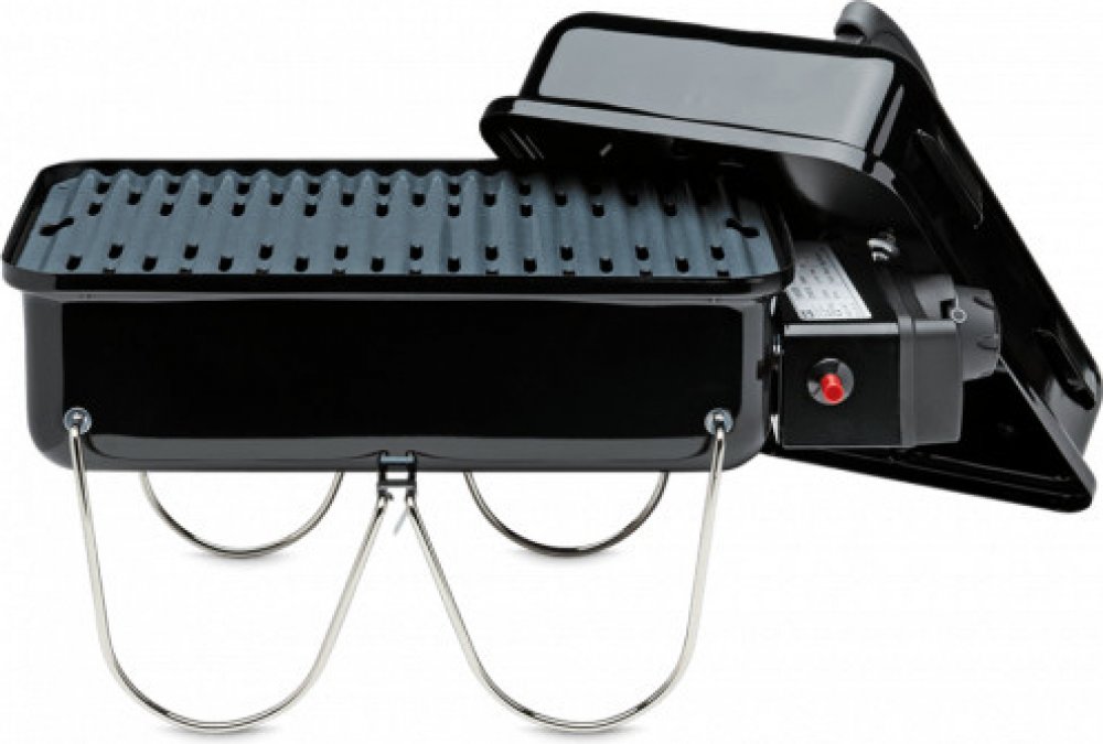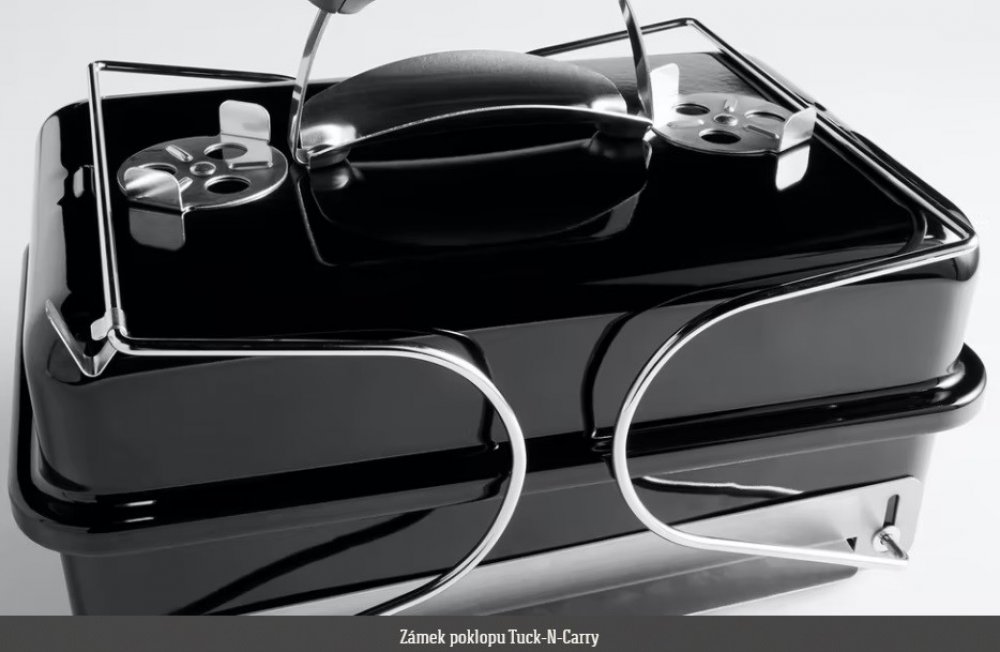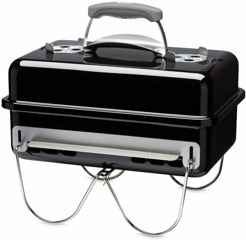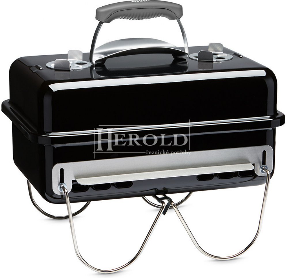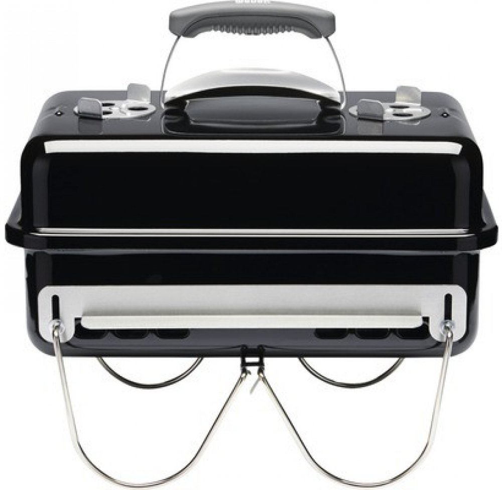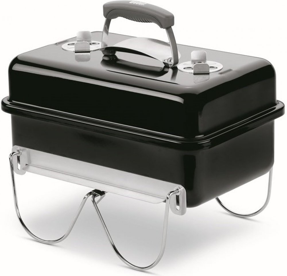 Přenosný gril na dřevěné uhlí Weber Go-Anywhere. Jedná se o menší snadno přenosný cestovní gril, který však disponuje solidním výkonem a dostatečnou grilovací plochou. Rukojeť je odolná vůči žáru a UV. Stabilní madlo z duroplastu s tepelným štítem umožňuje pohodlné uchopení a jednoduchý přenos. Na poklopu je instalován větrací průduch s hliníkovým uzávěrem ke snadné regulaci teploty, tak aby vyhovovala připravovanému jídlu. Poklop a kotel grilu je smaltovaný porcelánem. Grilovací rošt je pochromovaný. Uzavřený kotel a sklapovací nohy umožňují snadný převoz.