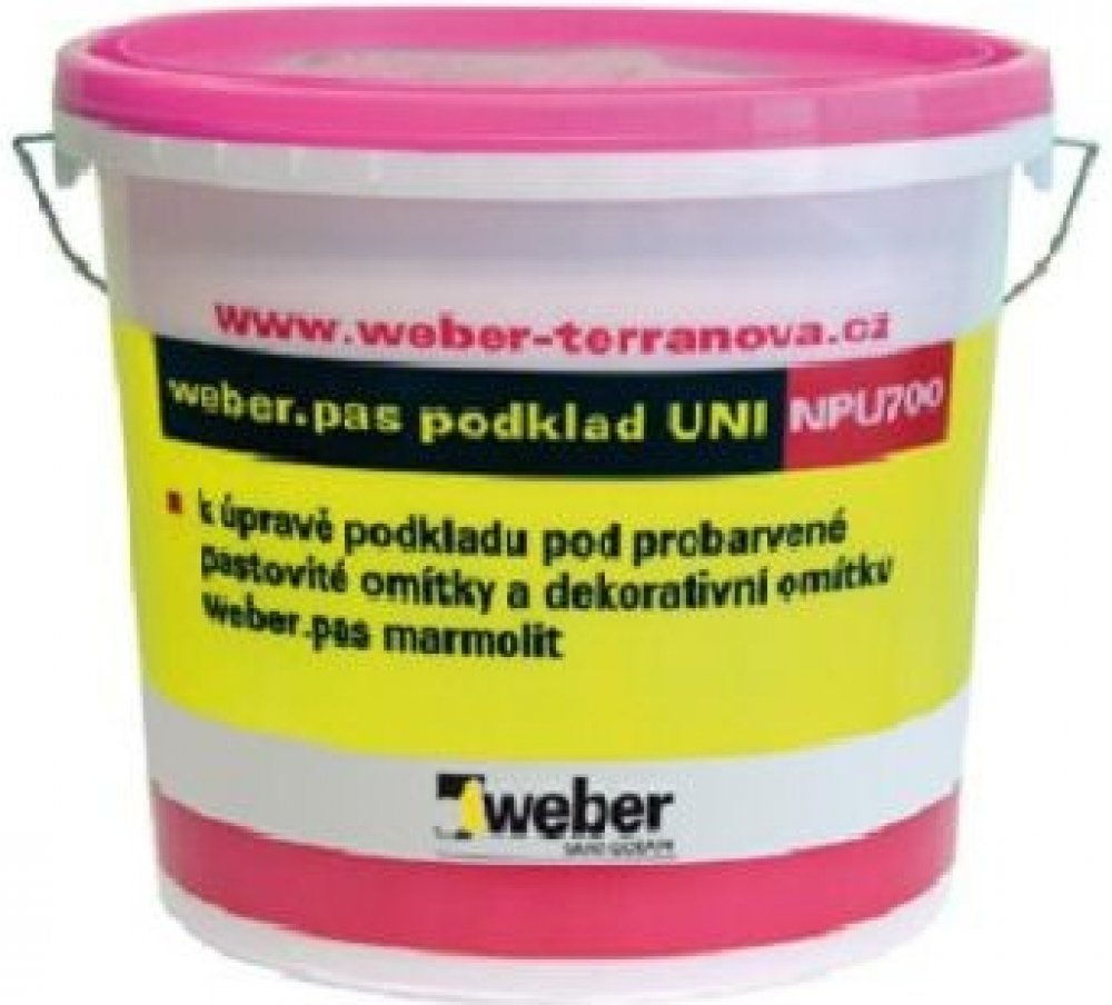 weber.pas podklad UNI je probarvený podkladní nátěr na bázi akrylátové disperze, připravený k přímému použití - k úpravě podkladu pod tenkovrstvé pastovité omítky a weber.pas marmolit. Barevný odstín se volí přibližně dle odstínu následně použité pastovité omítky, pod weber.pas marmolit se používá bílý odstín podkladního nátěru.