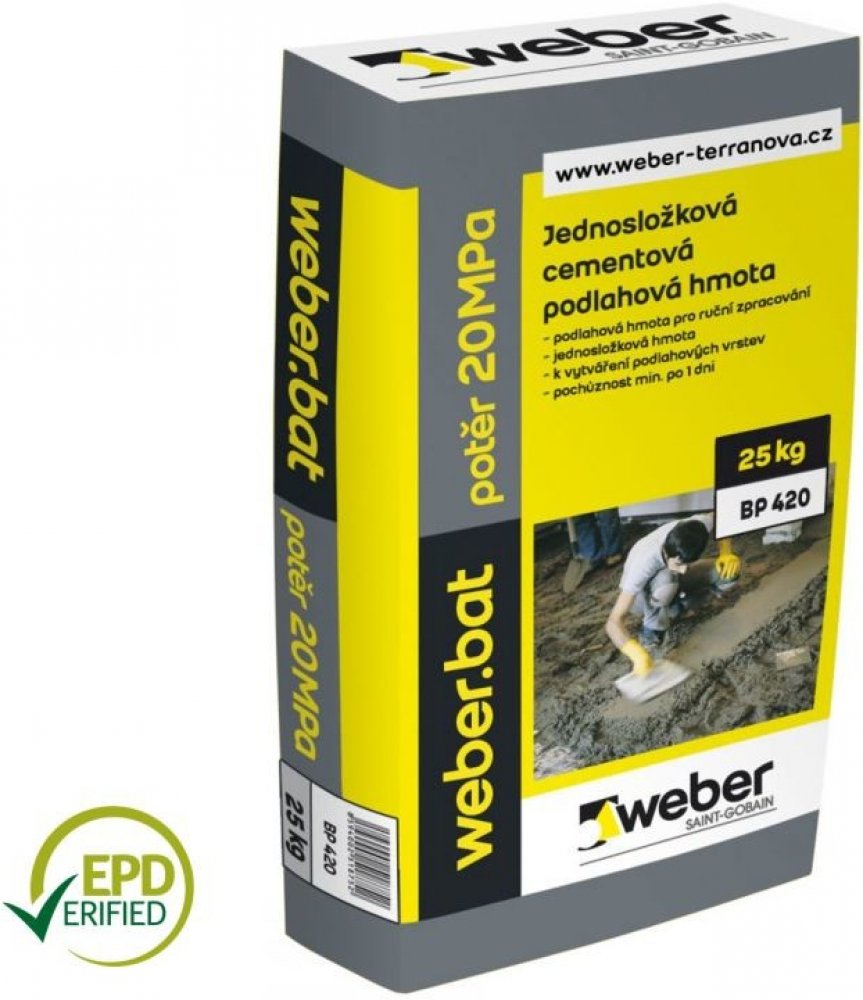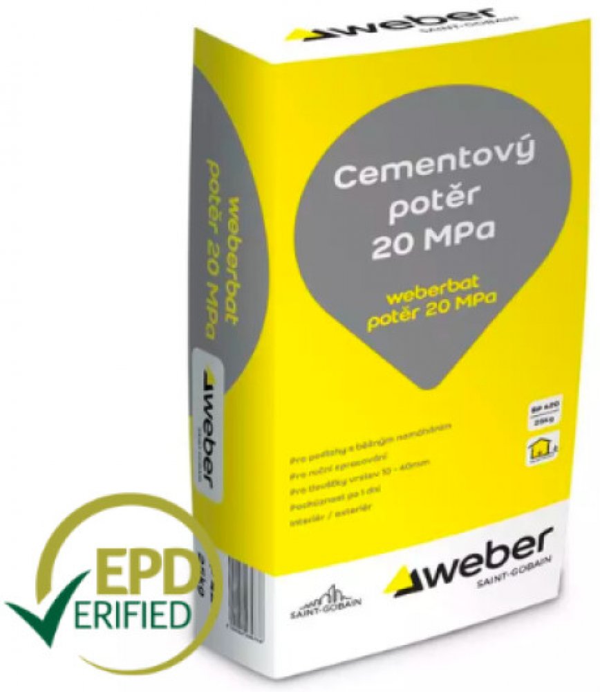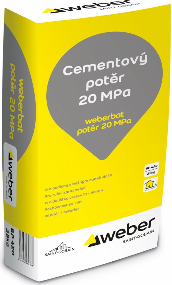 pro provádění vyrovnávacích vrstev připojených potěrů v tl. 10–40 mm, ruční zpracování, do interiéru, pevnost 20 MPa, zrnitost 4 mm, spotřeba 18–21 kg/m2/10 mm
