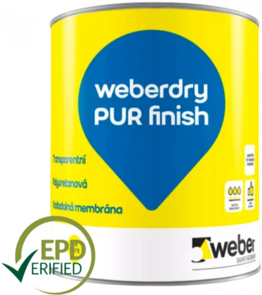 Popis produktu: Weberdry PUR finish je saténově matný, průhledný, polotuhý, jednosložkový, UV resistentní, polyuretanový nátěr používaný pro matnou konečnou úpravu na polyuretanový povlak Weberdry PUR trans. Weber dry PUR finish je odolný proti ultrafialovému záření, je nežloutnoucí a odolný proti oděru, zásadám a chemikáliím. Propůjčuje povrchu saténově matný vzhled. Weber dry PUR finish používá jedinečný systém vytvrzování a na rozdíl od jiných podobných systémů, nereaguje s vlhkostí (vytvrzování vlhkem) a netvoří bubliny. Výrobek je určen pouze pro profesionální uživatele.