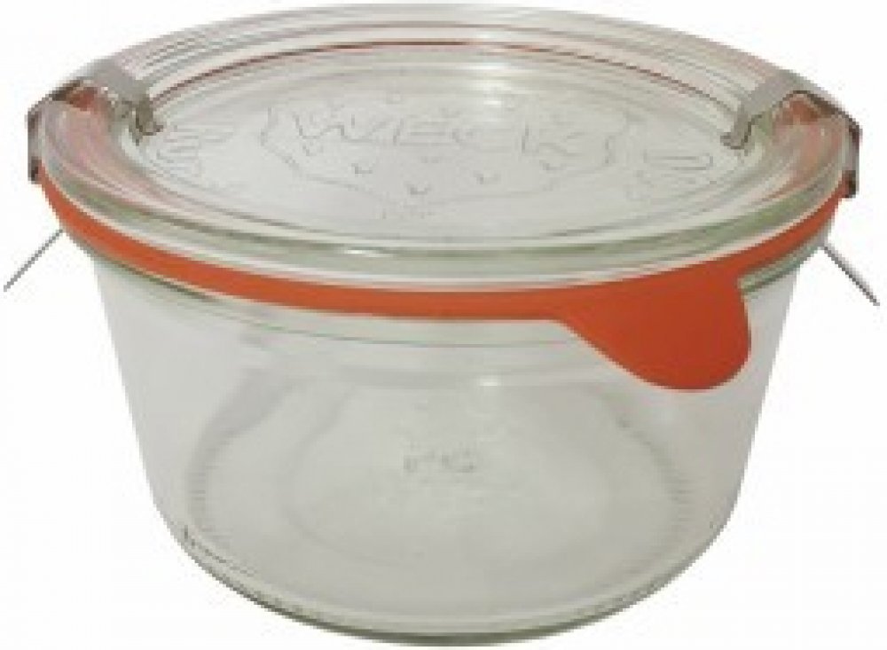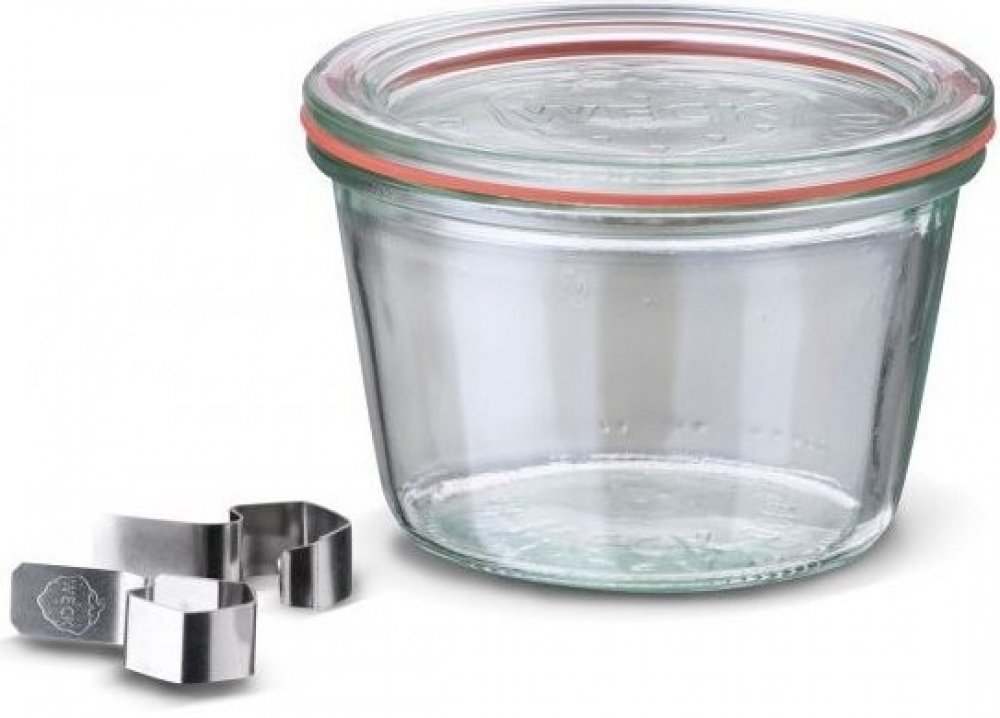 Zavařovací sklenice WECK 370 ml, včetně víčka, gumového těsnění a dvou kovových sponek.