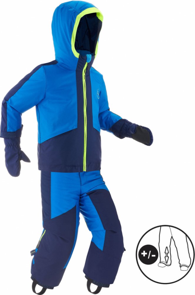Hřejivé, nepromokavé a nastavitelné kalhoty s bundou (délka rukávů a nohavic) a palcovými rukavicemi – vše lze sepnout a vytvořit kombinézu, která chrání před chladem i vnikáním sněhu pod oblečení.