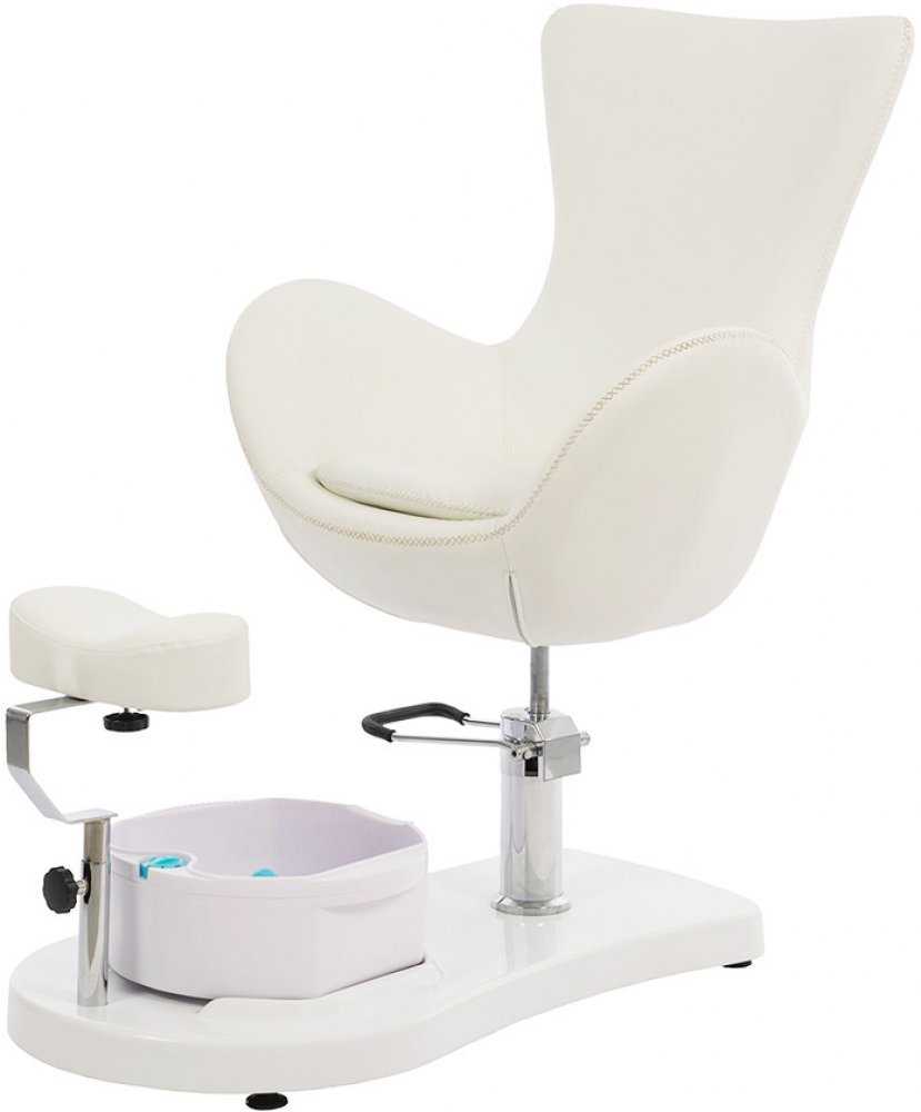 Pedikérská židle s pro nohy pro nohy a výškově i délkově nastavitelnou opěrkou nohou. Výška a otáčení sedadla jsou nastavitelné hydraulickým pístem s blokovacím systémem. Snadno čistitelné bílé čalounění z PU.