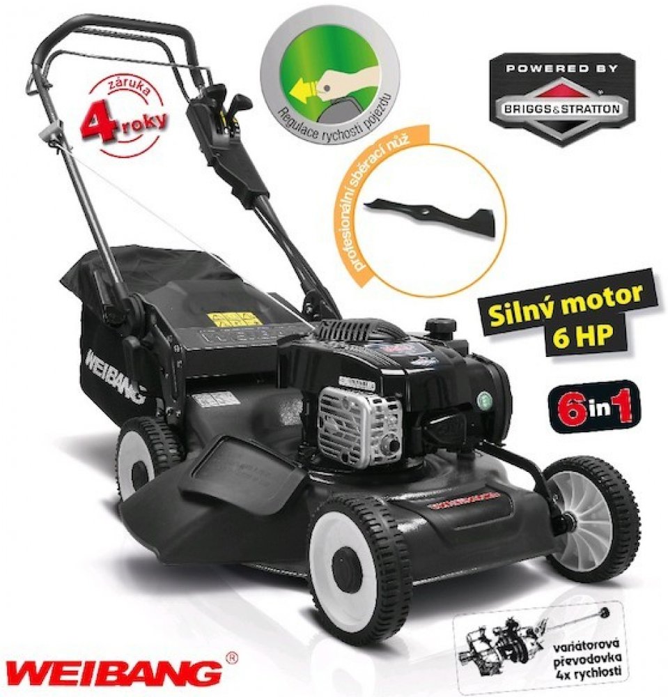 Sekačka WEIBANG WB 506 SBV 6in1 vyniká speciálním pevným a masivním ocelovým šasim. Velkou předností této sekačky je variabilnost použití funkcí 6 in 1, což znamená, že sekačka WEIBANG WB 506 SBV 6in1 umí sbírat posečenou trávu do koše, mulčuje, vyhazuje trávu bokem, zadním deflektorem a má variabilní pojezd daný 3 rychlostní variátorovou převodovkou.