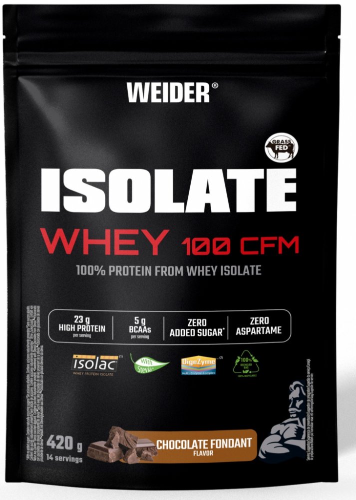 WEIDER Protein Isolate Whey 100 CFM - čokoládový fondán 420 g Prášek pro přípravu nápoje na bázi izolátu syrovátkové bílkoviny a enzymů. Určen sportovcům a fyzicky aktivním lidem.