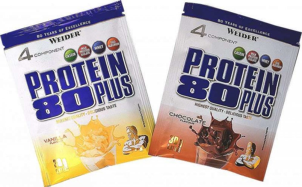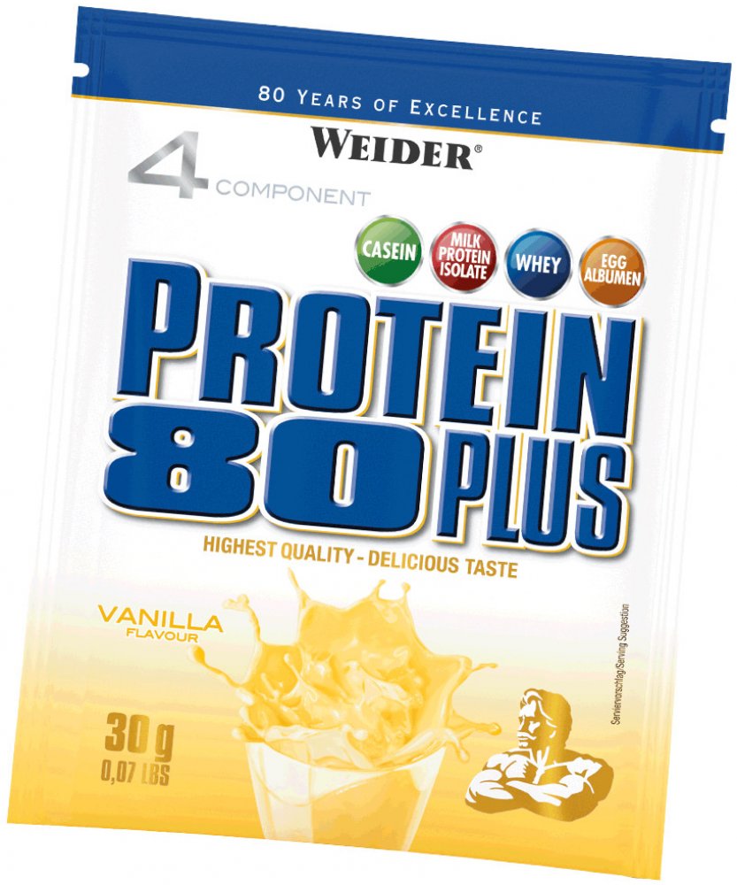 Weider Protein 80 Plus je chutný 4-složkový protein s 80% obsahem vysoce kvalitních bílkovin. Základ tvoří směs z 4 různých zdrojů proteinů jako jsou kaseinát vápenatý, syrovátkový koncentrát, mléčný izolát a vaječný albumin. Kombinace rychle a pomalu stravitelných bílkovin zajišťuje konstantní přísun aminokyselin do krve, čímž přispívá k růstu a udržení svalové hmoty. Protein 80 Plus se vyznačuje nízkým obsahem sacharidů a tuků. Přidaný vápník přispívá ke správnému fungování trávicích enzymů a k normálnímu fungování svalů. Protein 80 Plus je obohacen o vitamin B6, který přispívá k normální látkové přeměně bílkovin a glykogenu a k snížení vyčerpání a únavy.