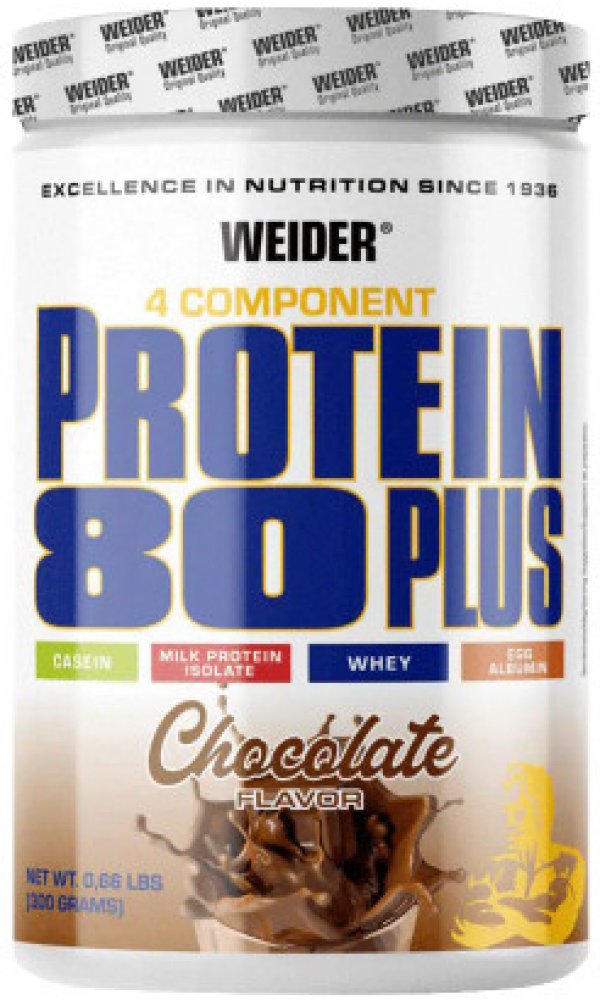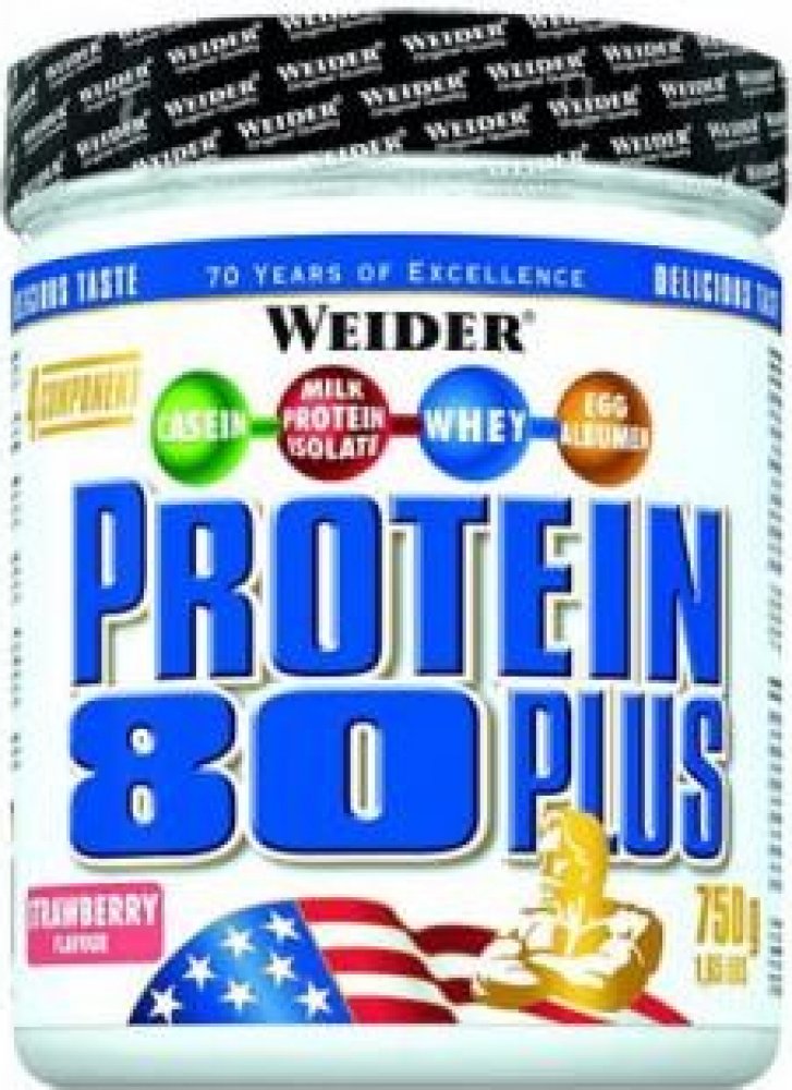Weider, Protein 80 Plus 4 Component: doplněk stravy. Proteinový nápoj v prášku. Čtyřsložkový proteinový prášek s kaseinátem vápenatým, izolátem mléčné bílkoviny, syrovátkovým koncentrátem a sušeným vaječným albuminem. Obsahuje vitamín B6, vápník a sladidla. Bílkoviny přispívají k růstu a udržení svalové hmoty. Upozornění: doplněk nenahrazuje vyváženou a různorodou stravu, která je pro správné fungování organismu nezbytně důležitá.