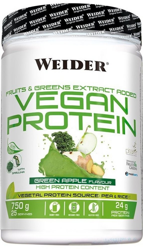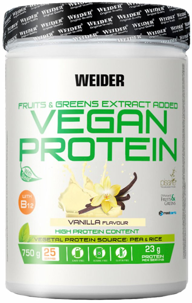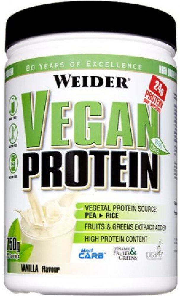 Veganský protein z německé dílny WEIDER. Určen pro doplnění bílkovin rostlinného původu, vhodný pro vegetariány a vegany.