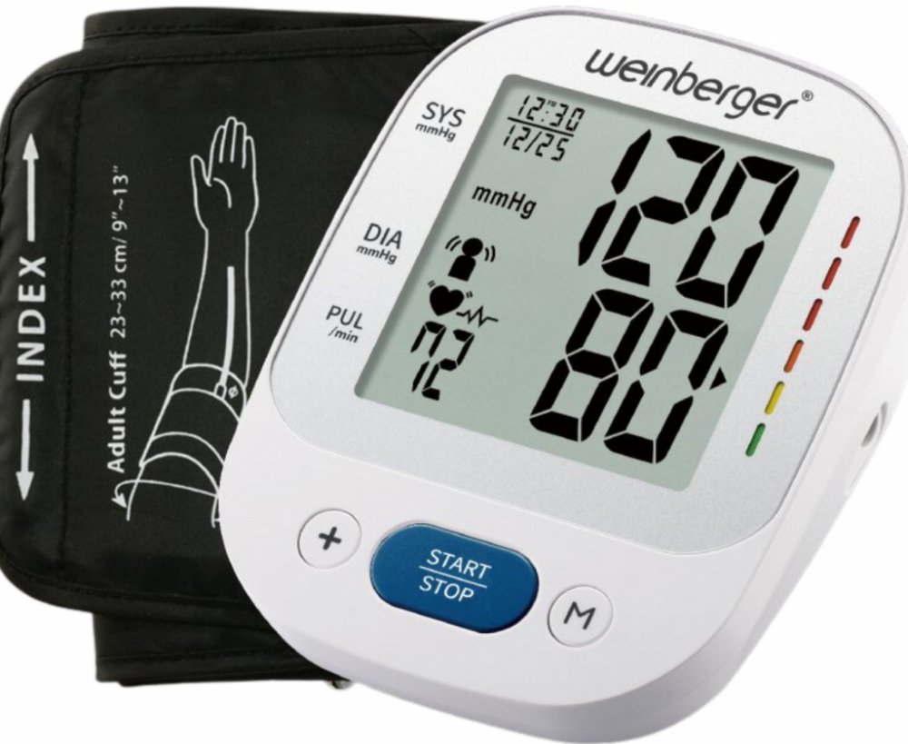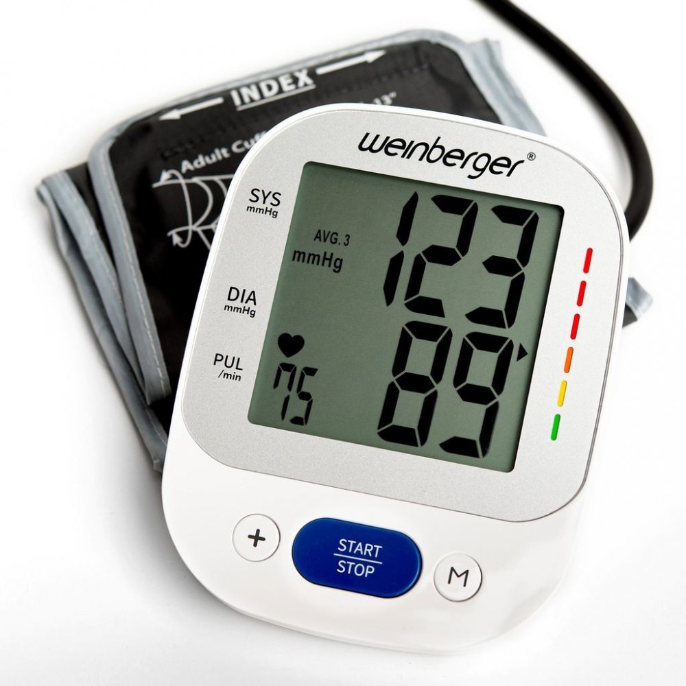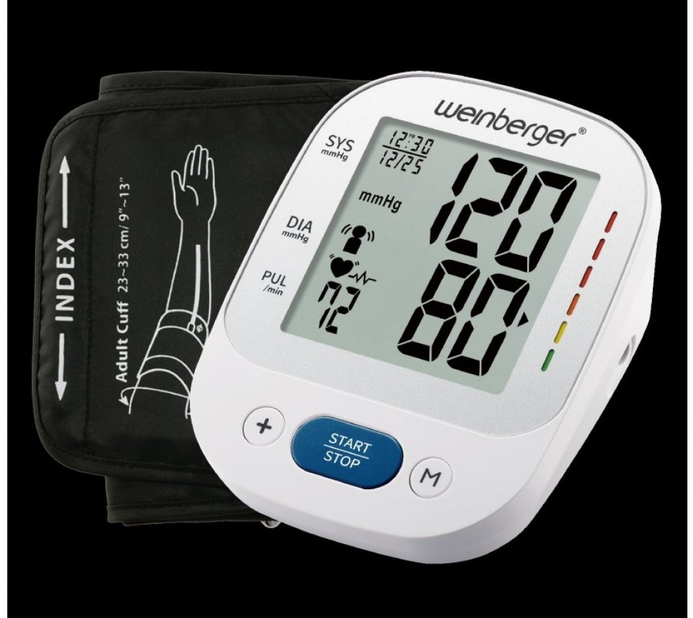 Manžeta na horní části paže fixuje zařízení a automaticky měří krevní tlak stisknutím tlačítka.