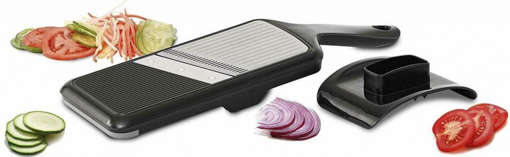 Velmi ostré struhadlo vyrobené z nerezavějící oceli a pevného plastu. Struhadlo má plynule nastavitelnou výšku řezu 1 - 4 mm a nabízí možnost krájení tenkých proužků julienne 3 x 3 mm. Struhadlo je opatřeno posuvným krytem na prsty.