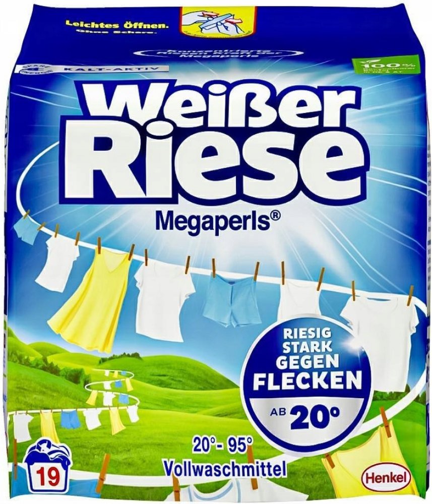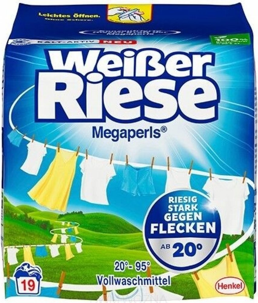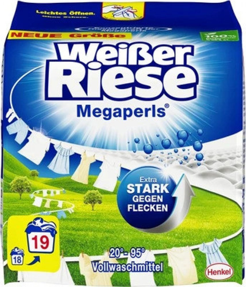 Weißer Riese Megaperls je silný na skvrny a je univerzálním pracím prostředkem, který zajišťuje zářivě čisté prádlo.