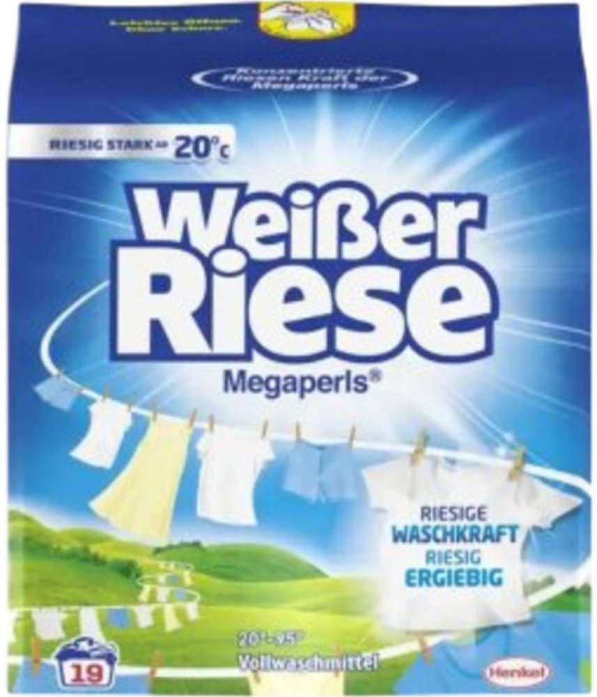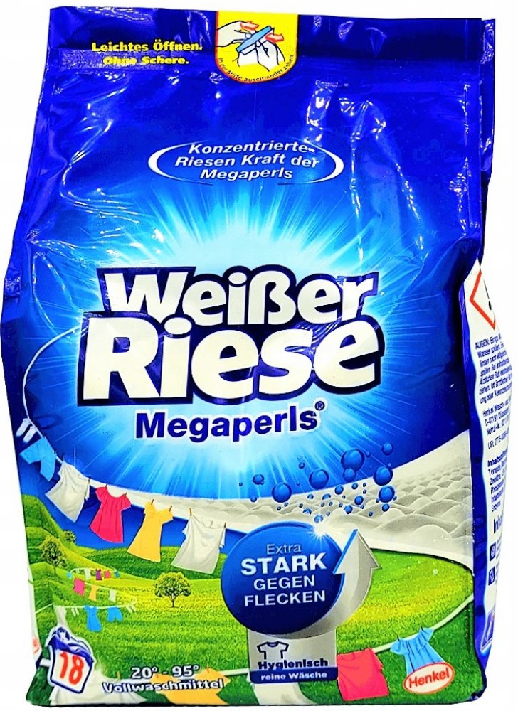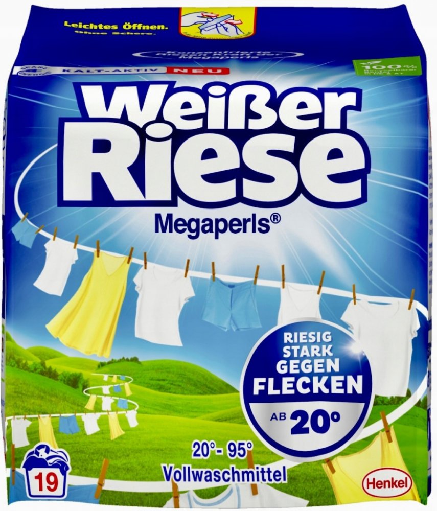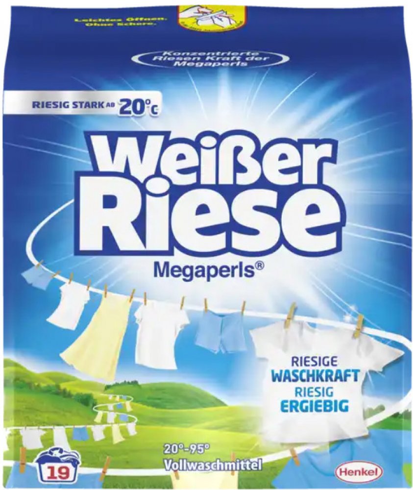 Německý Vysoce koncentrovaný univerzální prací prášek na bílé a stálobarevné prádlo s vysoce účinnou schopností odstraňování skvrn. Prací prášek od značky Weisser Riese je v Německu jeden z nejoblíbenějších díky své silné čistící schopnosti a krásné svěží vůni. Navíc obsahuje formuli Flecken-Detektiv, což je funkce, která odstraňuje i silně znečištěné fleky na prádle. Účinné prací teploty: 20 - 95°C. Pro zářivě čisté a svěží prádlo beze skvrn a bez zašednutí každý den. Obsah: 1,14 kg. Značka: Weisser Riese. Výrobce: Henkel.VÝHODY:Vysoce koncentrovaný prášek v podobě mikrogranulí od značky s dlouholetou tradicí v Německu. Svěží voní. Silná čistící schopnost. Biologicky odbouratelný a šetrný k životnímu prostředí. Na bílé a stálobarevné prádlo. Obsahuje formuli na odstraňování i té nejsilnější nečistoty. Zabraňuje zašednutí prádla.POUŽITÍ:V případě praní v automatické pračce aplikujte požadovanou dávku (viz obal výrobku s dávkováním) do hlavního dávkovače pracího prostředku nebo přímo do bubnu pračky. V případě ručního praní nechte rozpustit ve vodě, a poté prádlo důkladně vymáchejte.SLOŽENÍ:viz Ingredients/Inhaltsstoffe na obale.DOVOZ:Německo.UPOZORNĚNÍ:Není vhodné pro vlnu a hedvábí. Při praní dodržujte vždy doporučení výrobce textilie. Způsobuje vážné podráždění očí. Pokyny pro bezpečné zacházení: Uchovávejte mimo dosah dětí. Je-li nutná lékařská pomoc, mějte po ruce obal nebo štítek výrobku. PŘI ZASAŽENÍ očí: Několik minut opatrmě oplachujte vodou. Vyjměte kontaktní čočky, jsou-li nasazeny a pokud je ze vyjmout snadno. Pokračujte ve vyplachování. Přetrvává-li podráždění očí: Vyhledejte lékařskou pomoc/ošetření. PŘI POŽITÍ: Necítite-li se dobře volejte TOXIKOLOGICKÉ INFORMAČNÍ STŘEDISKO nebo lékaře. Po použití si umyjte ruce. Upozornění: Silně dráždí oči, skladujte mimo dosah dětí. Při zasažení očí, okamžitě omyjte velkým množstvím vody. Při požití nevyvolávejte zvracení, dítěti hrozí nebezpečí vdechnutí vytvořené pěny, okamžitě vyhledejte lékařskou pomoc a ukažte tento obal nebo označení. Třídění a vývěr pracího prostředku: Dbejte na symboly na oblečení a přizpůsobte tomu stupeň praní.ŽIVOTNÍ PROSTŘEDÍ:Zcela Biologicky odbouratelný a šetrný k životnímu prostředí. Zcela prázdný a čistý plastový obal výrobku je možné recyklovat. Neodhazujte obal ani výrobek do volné přírody. Třídění má smysl.
