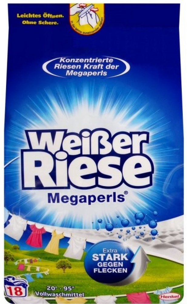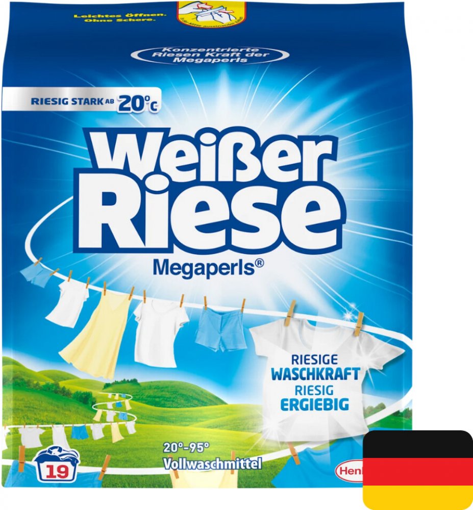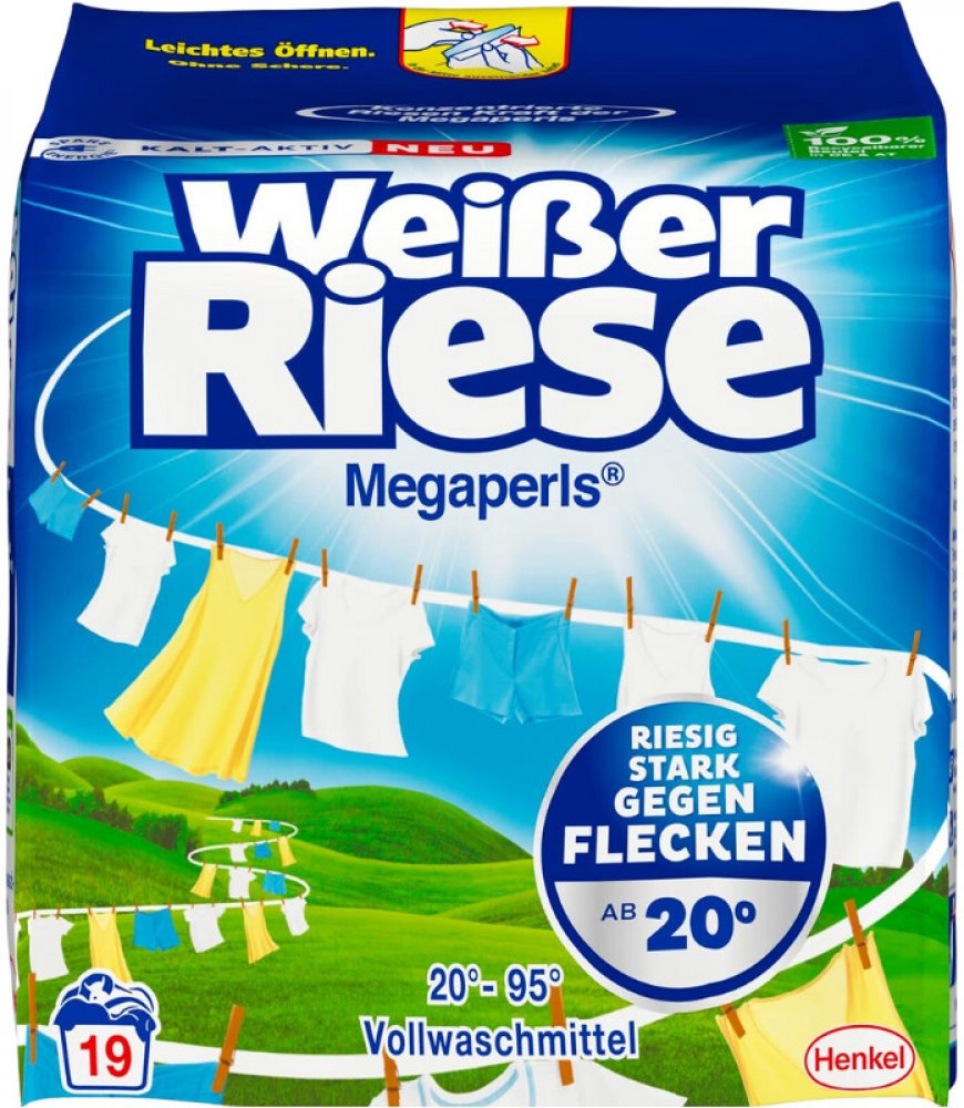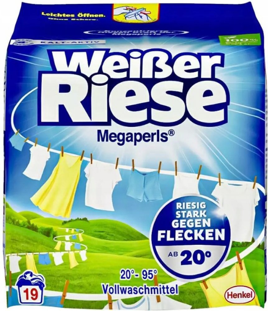 Německý Vysoce koncentrovaný univerzální prací prášek na bílé a stálobarevné prádlo s vysoce účinnou schopností odstraňování skvrn. Prací prášek od značky Weisser Riese je v Německu jeden z nejoblíbenějších díky své silné čistící schopnosti a krásné svěží vůni. Navíc obsahuje formuli Flecken-Detektiv, což je funkce, která odstraňuje i silně znečištěné fleky na prádle. Účinné prací teploty: 20 - 95°C. Pro zářivě čisté a svěží prádlo beze skvrn a bez zašednutí každý den. Obsah: 1,14 kg. Značka: Weisser Riese. Výrobce: Henkel.VÝHODY:Vysoce koncentrovaný prášek v podobě mikrogranulí od značky s dlouholetou tradicí v Německu. Svěží voní. Silná čistící schopnost. Biologicky odbouratelný a šetrný k životnímu prostředí. Na bílé a stálobarevné prádlo. Obsahuje formuli na odstraňování i té nejsilnější nečistoty. Zabraňuje zašednutí prádla.POUŽITÍ:V případě praní v automatické pračce aplikujte požadovanou dávku (viz obal výrobku s dávkováním) do hlavního dávkovače pracího prostředku nebo přímo do bubnu pračky. V případě ručního praní nechte rozpustit ve vodě, a poté prádlo důkladně vymáchejte.SLOŽENÍ:viz Ingredients/Inhaltsstoffe na obale.DOVOZ:Německo.UPOZORNĚNÍ:Není vhodné pro vlnu a hedvábí. Při praní dodržujte vždy doporučení výrobce textilie. Způsobuje vážné podráždění očí. Pokyny pro bezpečné zacházení: Uchovávejte mimo dosah dětí. Je-li nutná lékařská pomoc, mějte po ruce obal nebo štítek výrobku. PŘI ZASAŽENÍ očí: Několik minut opatrmě oplachujte vodou. Vyjměte kontaktní čočky, jsou-li nasazeny a pokud je ze vyjmout snadno. Pokračujte ve vyplachování. Přetrvává-li podráždění očí: Vyhledejte lékařskou pomoc/ošetření. PŘI POŽITÍ: Necítite-li se dobře volejte TOXIKOLOGICKÉ INFORMAČNÍ STŘEDISKO nebo lékaře. Po použití si umyjte ruce. Upozornění: Silně dráždí oči, skladujte mimo dosah dětí. Při zasažení očí, okamžitě omyjte velkým množstvím vody. Při požití nevyvolávejte zvracení, dítěti hrozí nebezpečí vdechnutí vytvořené pěny, okamžitě vyhledejte lékařskou pomoc a ukažte tento obal nebo označení. Třídění a vývěr pracího prostředku: Dbejte na symboly na oblečení a přizpůsobte tomu stupeň praní.ŽIVOTNÍ PROSTŘEDÍ:Zcela Biologicky odbouratelný a šetrný k životnímu prostředí. Zcela prázdný a čistý plastový obal výrobku je možné recyklovat. Neodhazujte obal ani výrobek do volné přírody. Třídění má smysl.