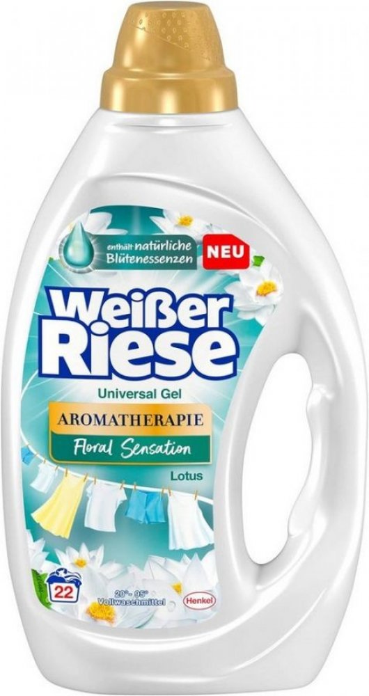 Weisser Riese gel 20 pracích dávek Universal Aromatherapie- první gel vyrobený z aromatických květinových esencí, varianta Universal z Bali Lotus White Lily. Tento prací gel je velmi silný proti skvrnám a je určený na bílé a stálobarevné prádlo. Je účinný až na 100 druhů různých skvrn. Prádlo si zachovává dlouhou životnost. Má silný čistící účinek, takže je vhodný pro rodiny s dětmi.DOVOZ:Německo.