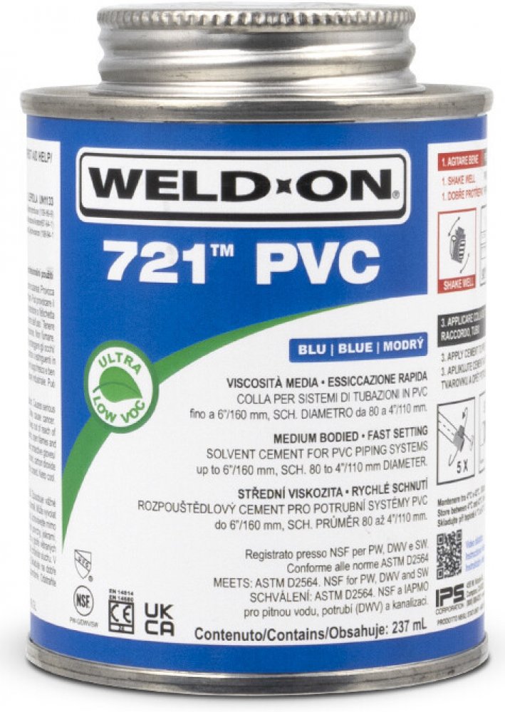Weld-On® 721™ je vhodné pro Sch. 40 PVC trubky až do 160 mm a Sch. 80 PVC až do 110 mm, a to bez nutnosti použití primeru (pokud to nevyžadují místní předpisy). To z něj činí univerzální volbu pro instalatéry, údržbáře bazénů a vířivek i pro běžnou domácí údržbu.