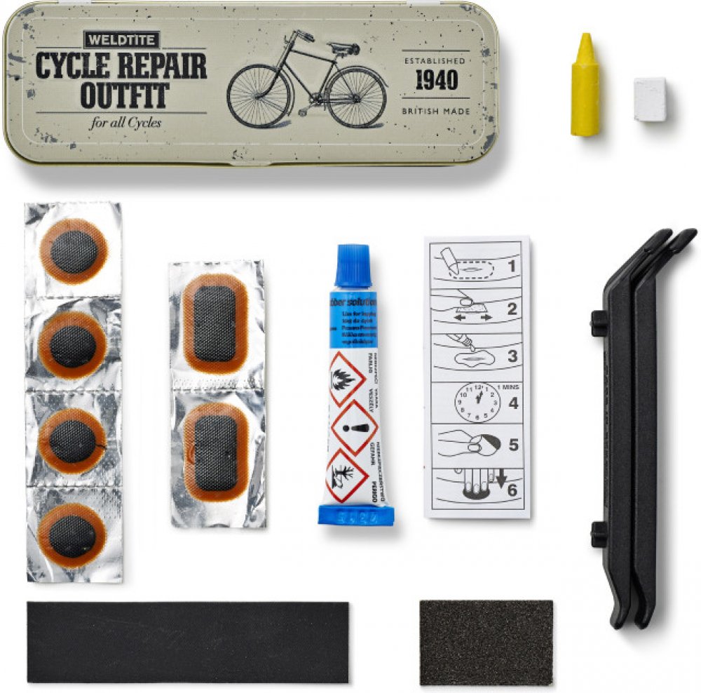 Nadčasová klasika. Sada Vintage je návratem k dřívějším dobám, kdy společnost Weldtite dodávala britské armádě materiály na opravu průrazů. Tato sada v kovové retro plechovce, která se vyrábí již 81. rokem, je ideálním dárkem pro každého cyklistu.
