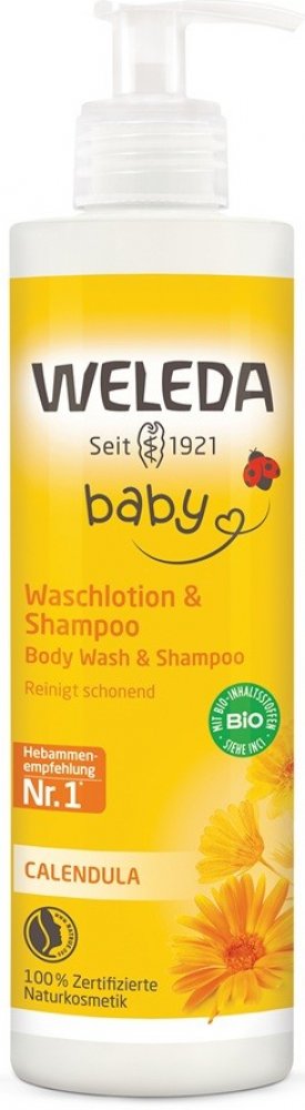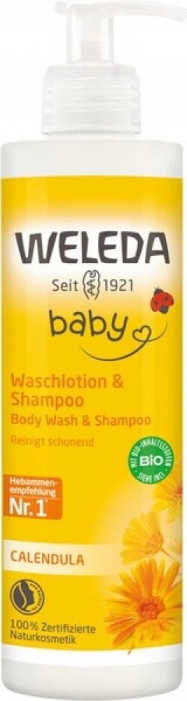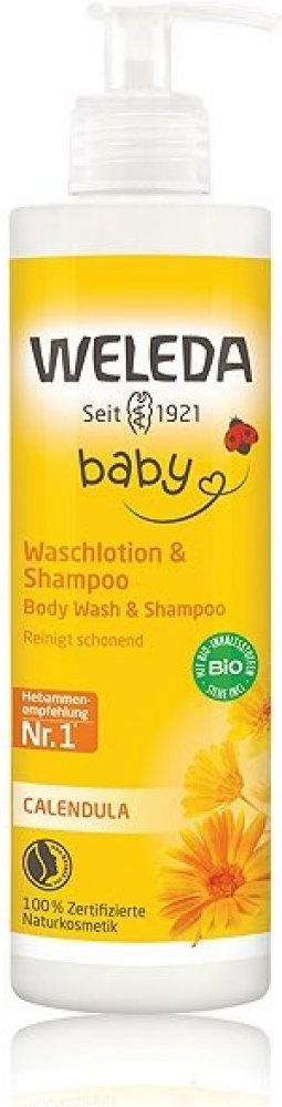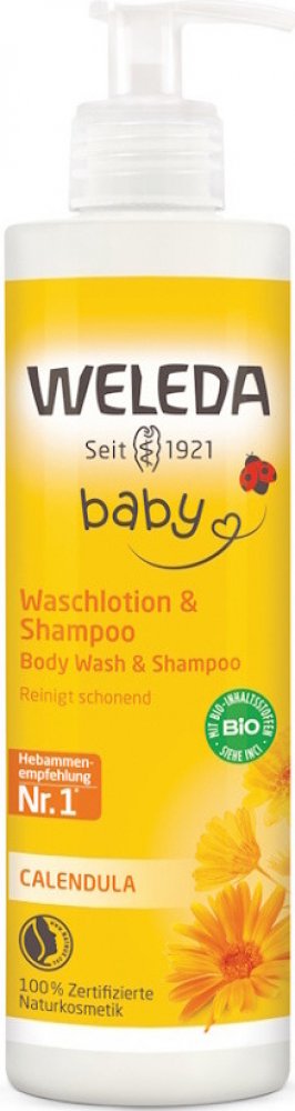 Měsíčkový mycí krém a šampón. Pro mytí od hlavy k patě. Lehce pěnivý mycí krém s bio-měsíčkem lékařským šetrně pečuje o jemnou dětskou pokožku a vlásky. Zanechává pokožku hebkou, vlásky se snadno rozčesávají a jemná pěna nepálí v očích. Je vhodný již od narození pro jemné mytí od hlavy až k patě. Velmi dobrá kožní snášenlivost i pro velmi citlivou pokožku a seboreu, dermatologicky potvrzeno. Použití: Malé množství mycího krému naneste na vlasy a tělo, jemně napěňte a důkladně opláchněte teplou vodou. Složení: Voda, Sezamový olej+, Coco-glucoside, Alkohol denat., Disodium cocoyl glutamate, Glycerin, Sodium cocoyl glutamate, Extrakt z květů Měsíčku lékařského+, Mandlový olej +, Karagenan, Kyselina mléčná, Xantanová guma, Vůně, Geraniol, Limonene, Linalool Země původu: Švýcarsko Adresa výrobce: Weleda AG, 73525 Schwäbisch-Gmünd, Germany, www.weleda.com