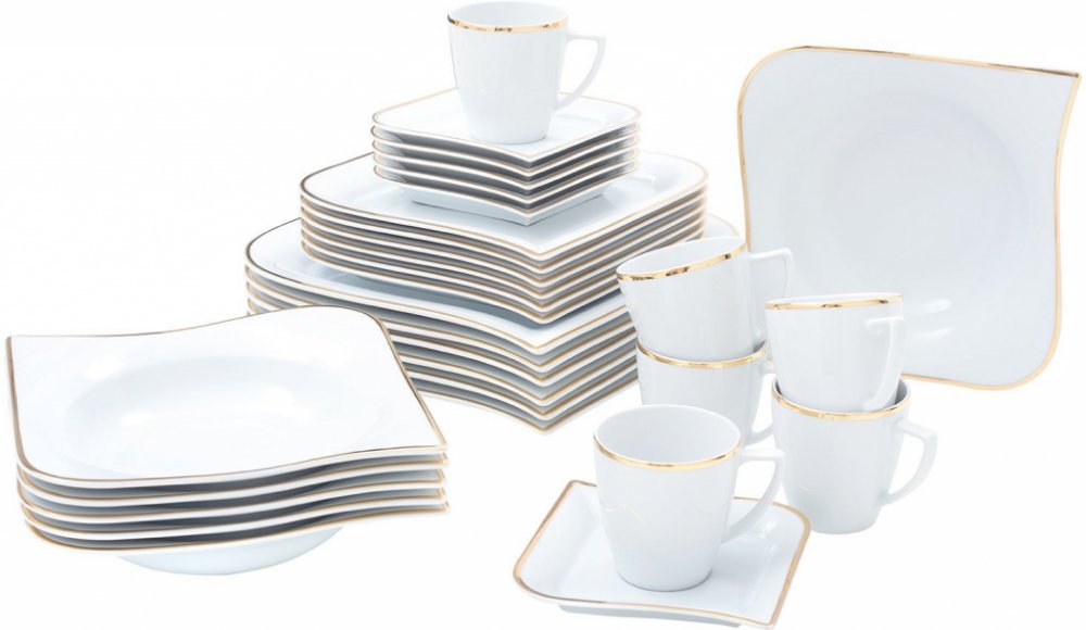 Vhodný do myčky na nádobí Z porcelánu Určený pro 6 osob 30dílná sada Obsah balení 6 jídelních talířů 6 talířů na polévku 6 šálků na kávu 6 podšálků 6 malých talířů Rozměry cca 36 x 33 x 29 cm (Š x V x H) Hmotnost cca 15,5 kg