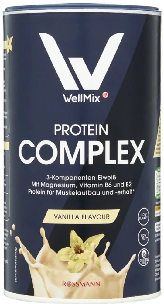Sypká směs k přípravě proteinového nápoje s vanilkovou příchutí, s hořčíkem, vitaminem B6 a riboflavinem, se sladidly.