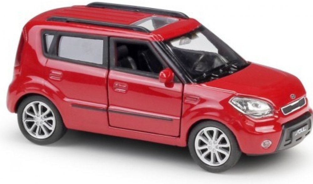 Kovový model auta Kia Soul v červené barvě a měřítku 1:32/39 značky Welly. Model autíčka má kovové osy kol a detailní zpracování karoserie včetně interiéru automobilu.Na modelu se otvírají přední dveře.