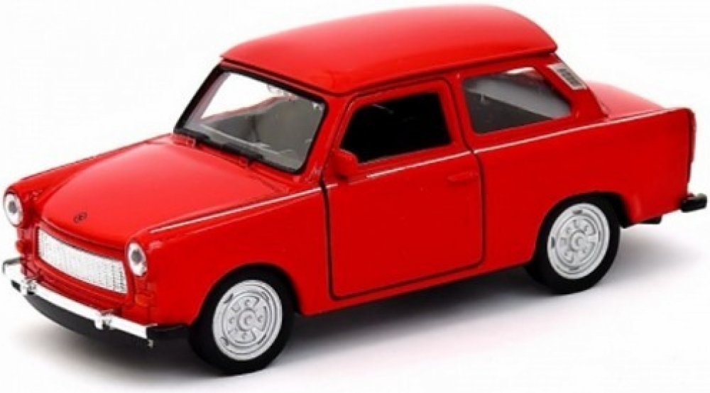 Kovový model auta Trabant 601 v červené barvě a měřítku 1:34/39 značky Welly. Model autíčka má kovové osy kol a detailní zpracování karoserie včetně interiéru automobilu. Na modelu se otvírají dveře.