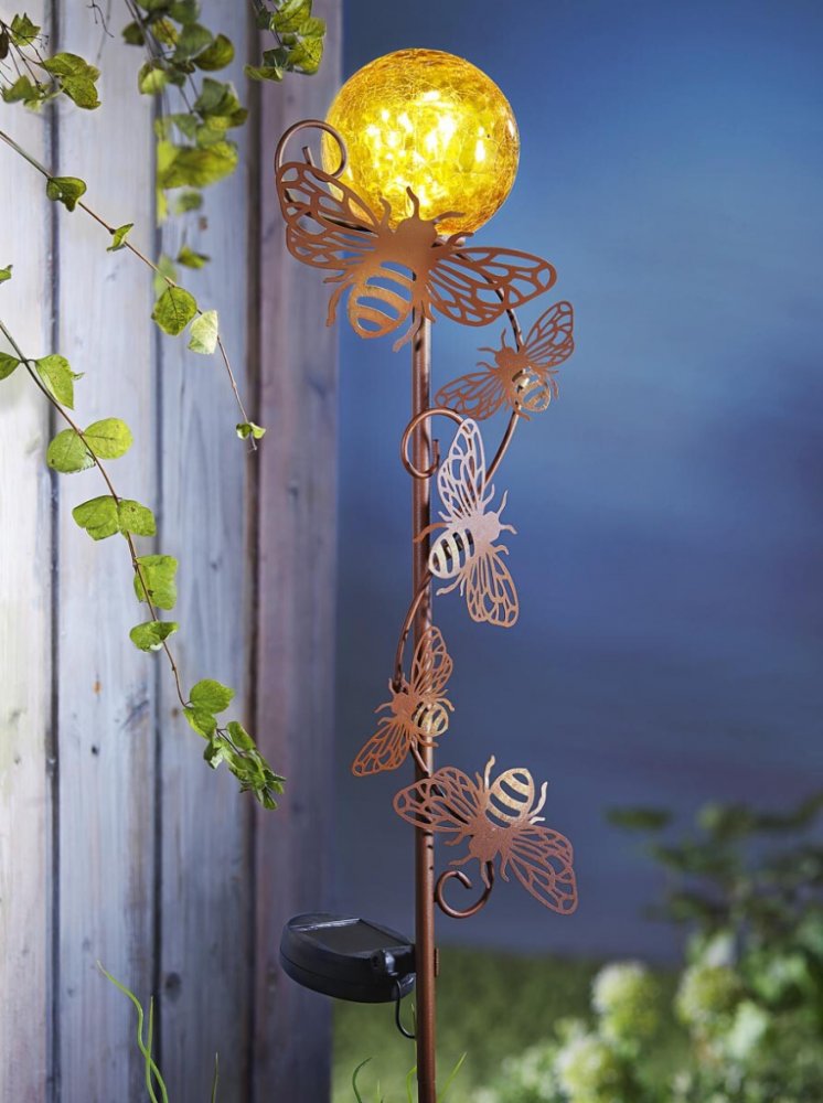 Působivá zahradní světelná dekorace s 5 včelkami je ušlechtilou kombinací kovu s patinou rzi a skla. Filigránové kovové včelky se zlatými akcenty a medově žlutá skleněná koule s 10 teplými bílými LED. Upevnění dvojitým zemním hrotem. Napájení integrovaným solárním panelem.