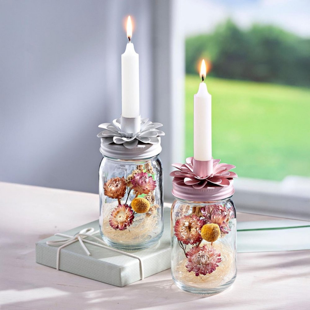 Sada dvou skleněných svícnů s víčkem ve tvaru květiny a nádherným vnitřním aranžmá ze sušených květin. Krásná i funkční dekorace, která ozdobí jakýkoliv interiér.