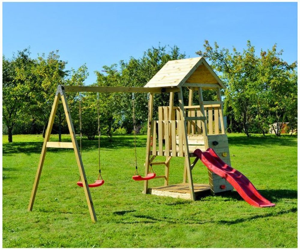 Dřevěná hrací věž pro děti je vyrobena z certifikovaného borovicového dřeva. Součástí je skluzavka, dvě houpačky a lezecká stěna, což zaručuje hodiny zábavy a hraní. Je vhodný pro děti od 4 let.