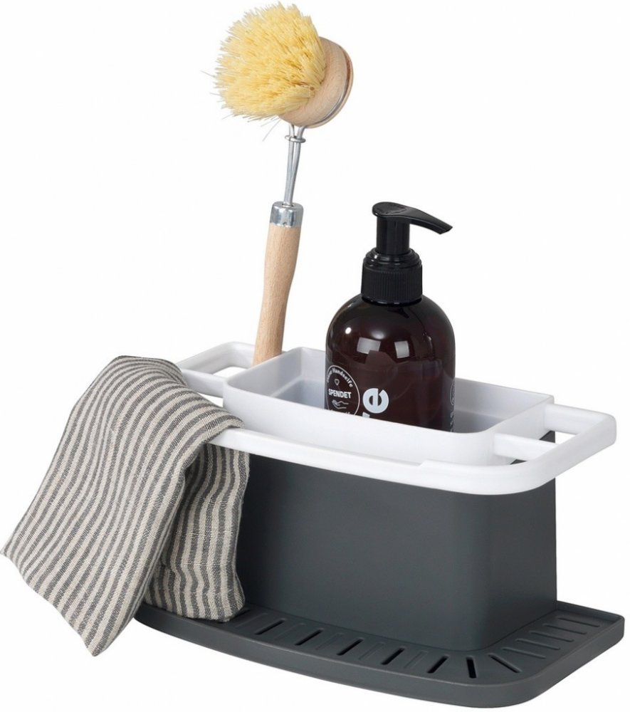 Praktický organizér pomůže uspořádat mycí potřeby na jedno místo a udržet tak pořádek u dřezu. Do úložného prostoru se vejde mycí prostředek, houbička, drátěnka, kartáče apod. Hadřík nebo utěrku snadno zavěsíte, necháte volně uschnout, aniž byste pokládali na kuchyňskou desku nebo nechávali ležet ve dřezu. Zamezíte tím růstu bakterií a vzniku zatuchlého zápachu. Úklidové pomůcky nejsou součástí prodeje.Organizér má odnímatelnou nádobu a odkapávací misku ve spodní části, kam odtéká voda z mokré houby nebo hadříku přes odtokovou mřížku. Organizér snadno rozeberete a vyčistíte. Protiskluzové nožičky. Kvalitní výrobek německé firmy Wenko. Rozměr: 21 x 11 x 11 cm. Materiál: odolný plast.