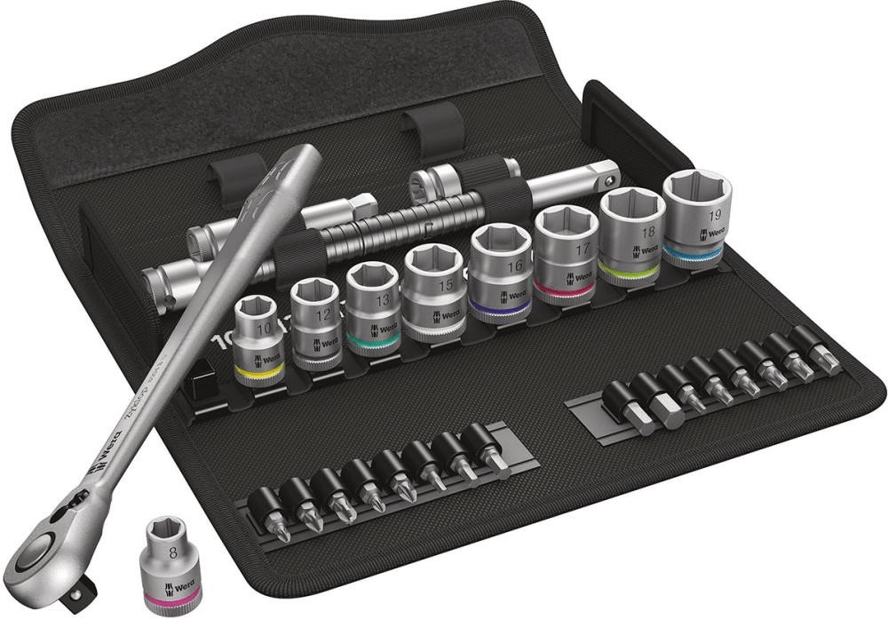 Provedení: Nástroje z chromvanadové oceli. Celokovová ráčna z chrom-molybdenu, kovaná. Extrémně štíhlá, s dlouhou pákou kvůli dobré přístupnosti ve stísněných prostorech a přenos vysokých krouticích momentů, s kuličkovou aretací pro bezpečné dosednutí ořechů. Nízká hmotnost pro vysokou pohyblivost, velká robustnost. Dodává se ve velmi kompaktním textilním boxu, chrání citlivé povrchy.