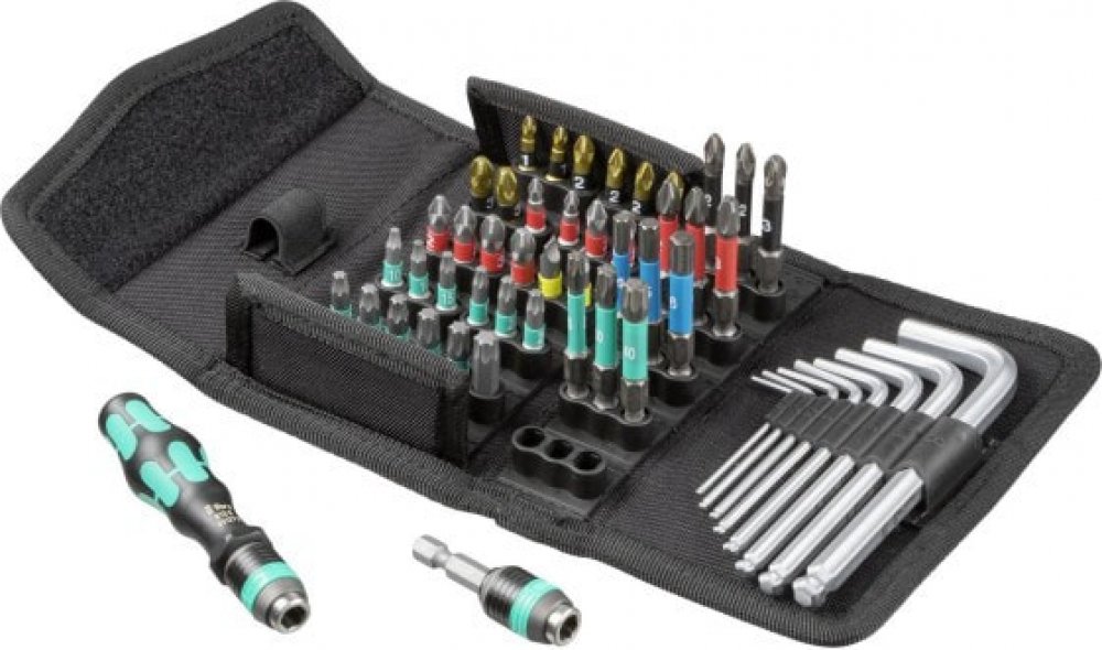 WERA Kraftform Kompakt 100, sada 52 dílů, 057460 Popis: V kompaktním, k povrchů šetrném a vysoce robustním textilním boxu. Nízký objem a hmotnost pro lepší mobilitu. Sada obsahuje: 1 ruční držák bitů Rapidaptor s rychlovýměnným upínačem 813 R - 1 x 1/4"x90 1 držák bitů Rapidaptor s rychlovýměnným upínačem k uchycení do šroubovacího stroje nebo k použití do sklíčidla elektrické vrtačky 889/4/1 K - 1 x 1/4"x50 30 torzních bitů BiTorsion s délkou 25 mm pro dlouhou životnost, houževnaté (BTZ), pro univerzální použití, extra tvrdé (BTH) 851/1 BTZ PH - 2 x PH 1x25, 4 x PH 2x25, 2 x PH 3x25 855/1 BTH PZ - 2 x PZ 1x25, 4 x PZ 2x25, 2 x PZ 3x25 867/1 TORX® BTZ - 2 x TX 10x25, 2 x TX 15x25, 3 x TX 20x25, 2 x TX 25x25, 2 x TX 30x25, 1 x TX 40x25 800/1 BTZ - 1 x 0,8x5,5x25, 1 x 1,0x5,5x25 12 bitů