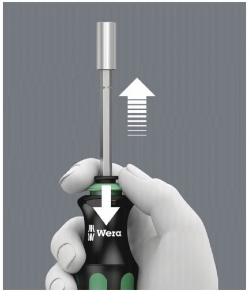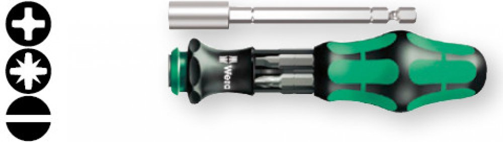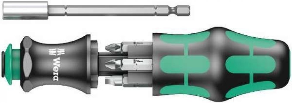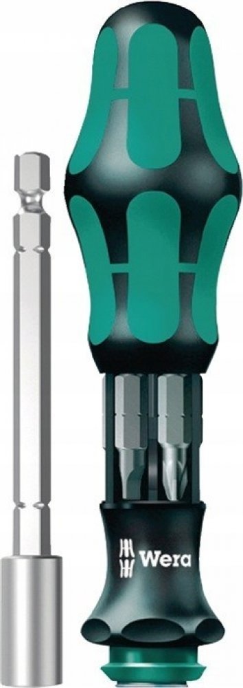 Šroubovák WERA se zásobníkem bitů 1/4" Rychlou a precizní práci vykonává zařaditelný planetový převod integrovaný do rukojeti šroubováku, který 4-násobně zvyšuje pracovní rychlost u jednoduchých šroubových spojů čistě mechanickým způsobem.Při práci jedna ruka fixuje přední část rukojeti, druhá ruka otáčí zadní část rukojeti. Funkci Turbo lze zařadit nebo vyřadit stisknutím tlačítka. Vyřazení dopor...