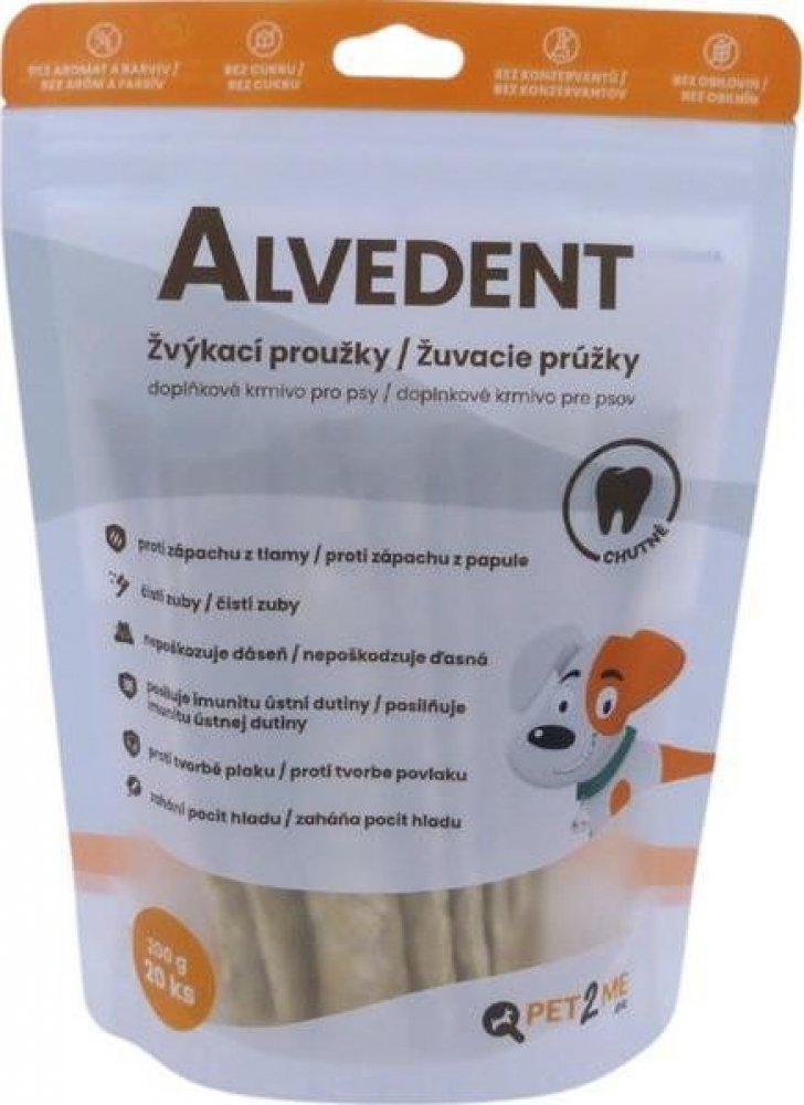 Pravidelné užívání žvýkacích proužků Alvedent pomáhá odstraňovat zápach z tlamy psa a bránit tvorbě plaku (z vrstev plaku se vytváří zubní kámen). Obsažená laktoperoxidáza zvyšuje přirozenou imunitu a obranyschopnost ústní dutiny. Žvýkáním chutných proužků si psi mechanicky čistí zuby a odstraňují zbytky krmiva. Současně se tak uvolňují enzymy, které zabraňují tvorbě plaku.