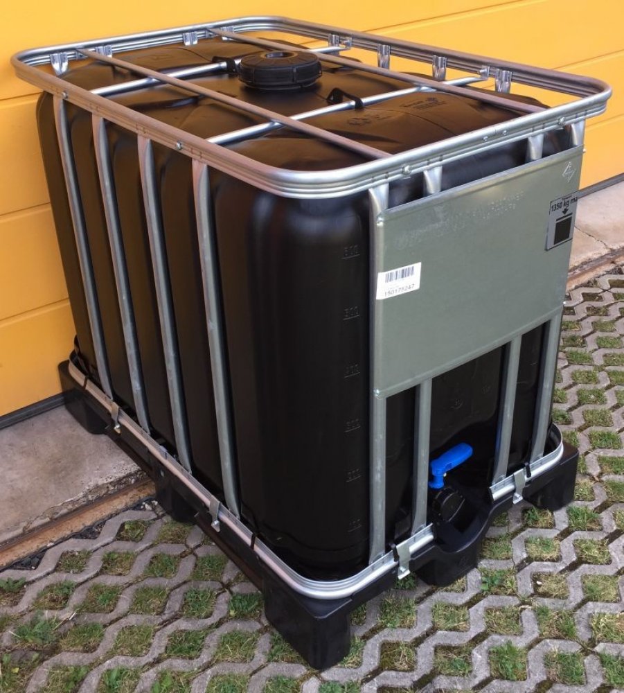 Komplet obsahuje novou klec na paletě s nádrží s integrovaným kohoutem, vrchní a spodní víčko.
