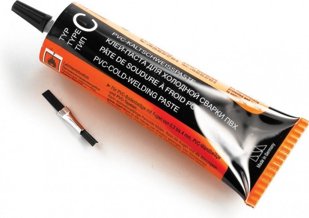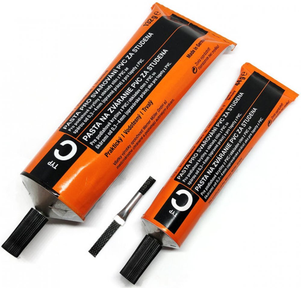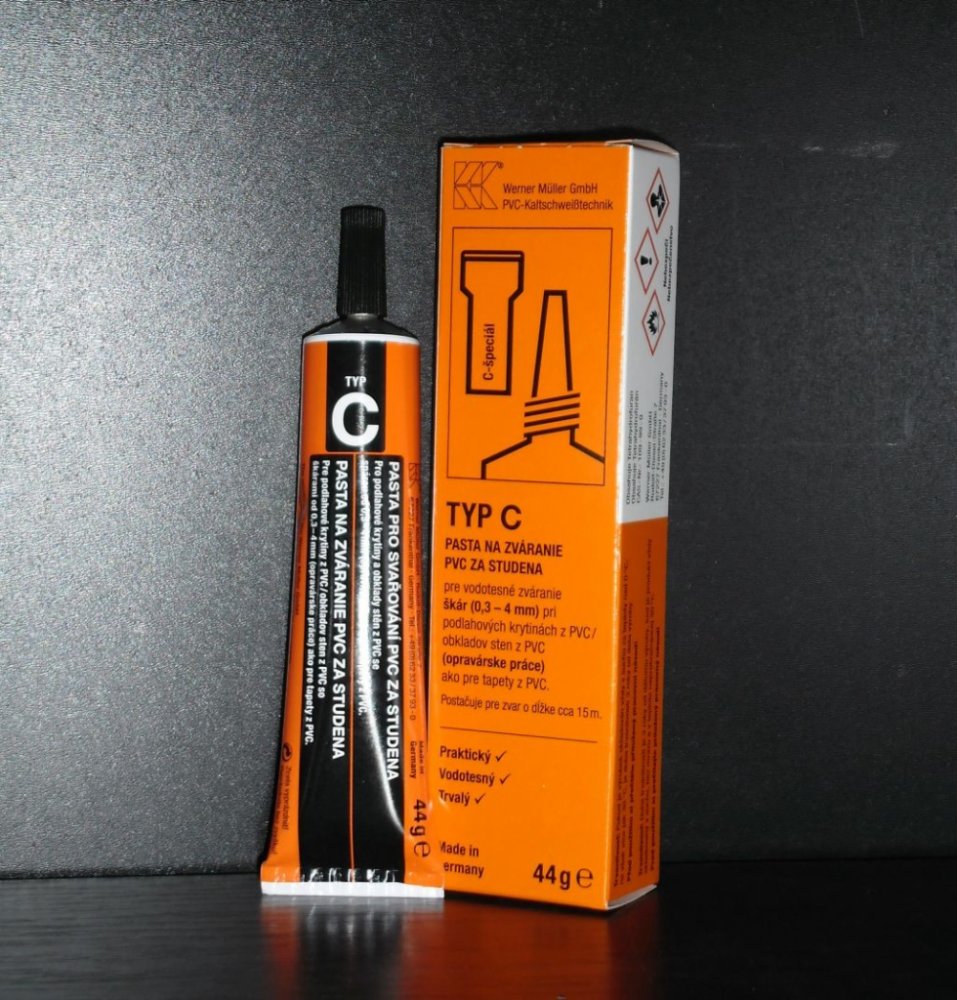 Svařovací tuba C neboli svár za studena je vhodný pro spojení dvou pásu PVC od 0,3 do 4 mm. Tuba má integrovaný kovový hrot a nástavec, který umožnuje penetraci svařovacího prostředku (tekutiny) hluboko do spoje, čím se spoj optimálně svaří. Návod k použití je přiložen v balení.