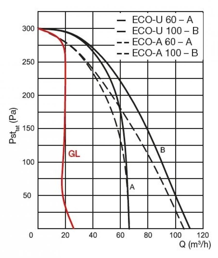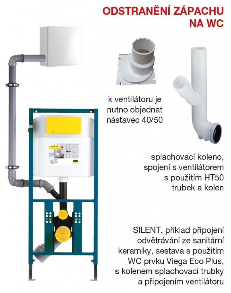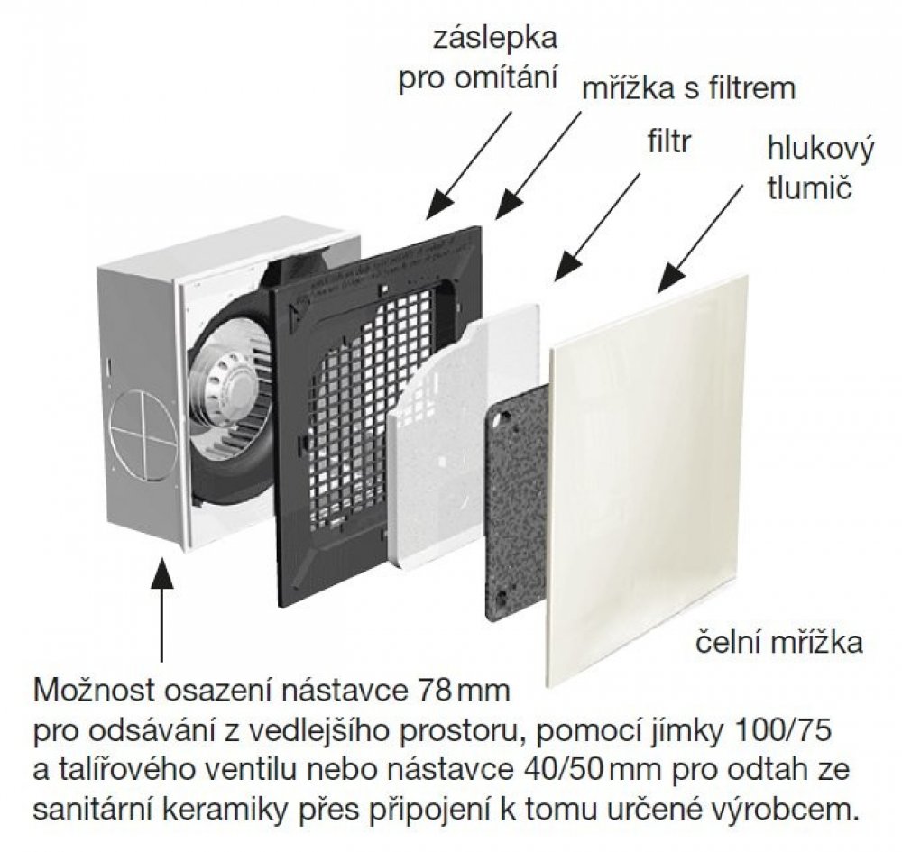 Malý radiální ventilátor SILENT ECO A 60 je vyroben z ABS plastu v bílé barvě. Ventilátor s označením ECO-A má výtlak směrem dozadu, průměr výtlačného hrdla je 78 mm. Ventilátor je vhodný pro náročné interiéry s dlouhým vzduchotechnickým potrubím a větší tlakovou ztrátou. Ventilátor SILENT ECO A je určen pro montáž na zeď / stěnu nebo strop.Skříň ventilátoruSkříň ventilátoru je vyrobena z ABS plastu v bílé barvě. Ventilátory s označením ECO-A mají výtlak směrem dozadu, průměr výtlačného hrdla je 78 mm. Ventilátory ECO-U má výtlak směrem dozadu (Z) nebo nahoru (H), pro vzduchotechnické potrubí o průměru 75 – 80 mm. Na výtlaku radiálního ventilátoru je zpětná klapka. Montáž je na zeď, pod omítku nebo do podhledu. Čelní mřížka obsahuje filtr a tlumič hluku.Oběžné koloOběžné kolo ventilátoru je radiální s dopředu zahnutými lopatkami, nalisované na vnějším rotoru.Motor ventilátoruMotor ventilátoru je asynchronní s vnějším rotorem, vysokou účinností a nízkou spotřebou. Motor je vybaven kuličkovými ložiskami, termo pojistkou proti přetížení. Maximální teplota okolí je 40°C. Krytí IPX5.Svorkovnice ventilátoruSvorkovnice ventilátoru je přístupná po demontáži čelní mřížky ve skříni ventilátoru.Regulace otáček ventilátoruRegulace otáček se provádí elektronickými regulátory.Montáž ventilátoruMontáž u ECO-U se provádí pod omítku nebo do podhledu, v horizontální i vertikální poloze. Nástavec pro odsávání vedlejších prostor lze podle potřeby umístit ze tří stran skříně, viz obrázek. Ventilátor se dodává sestavený, skříň je zakryta dočasným víkem proti zašpinění a po montáži se nahradí čelní deskou, která je volně přiložena. Na zvláštní objednávku lze dodat skříň, motorventilátor a čelní desku samostatně. Nepřesnost zazdění je možno vyrovnat pootočením čelní mřížky až o cca 10?. Montáž ECO-A se provádí na stěnu nebo na podhled