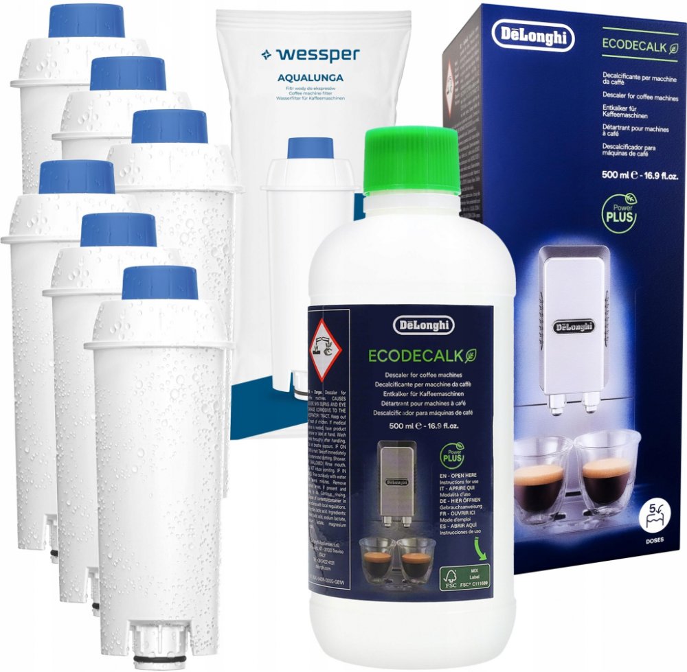 Sada pro kávovar Delonghi: 6 x vodní filtr Wessper AquaLunga + originální odvápňovač Delonghi 500 ml