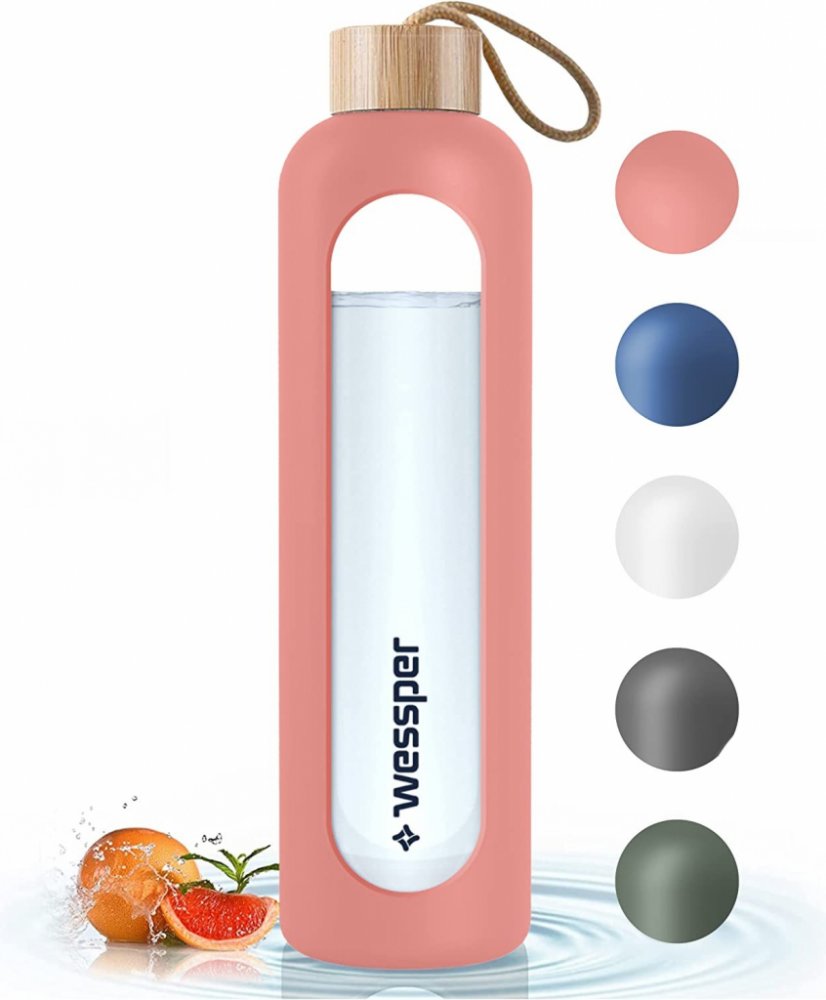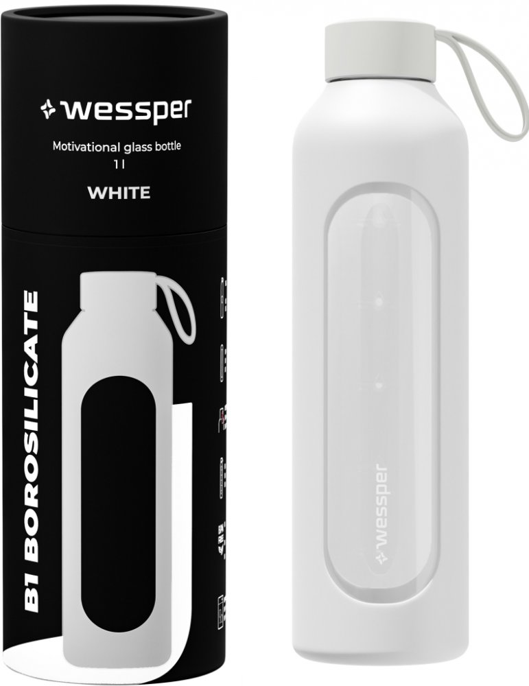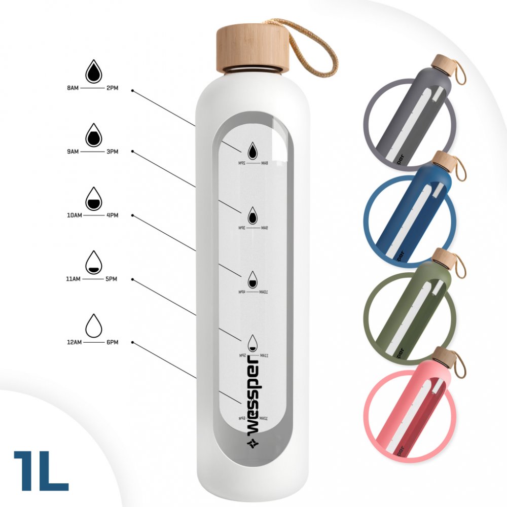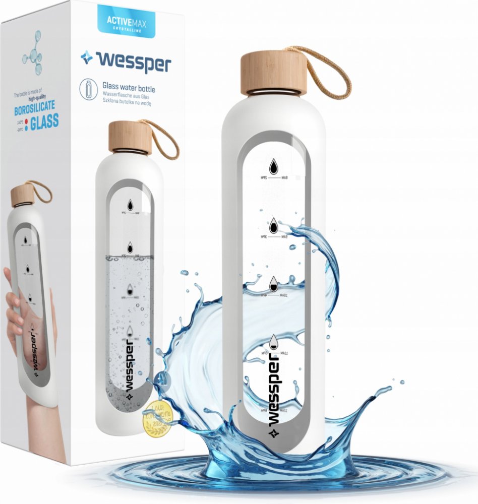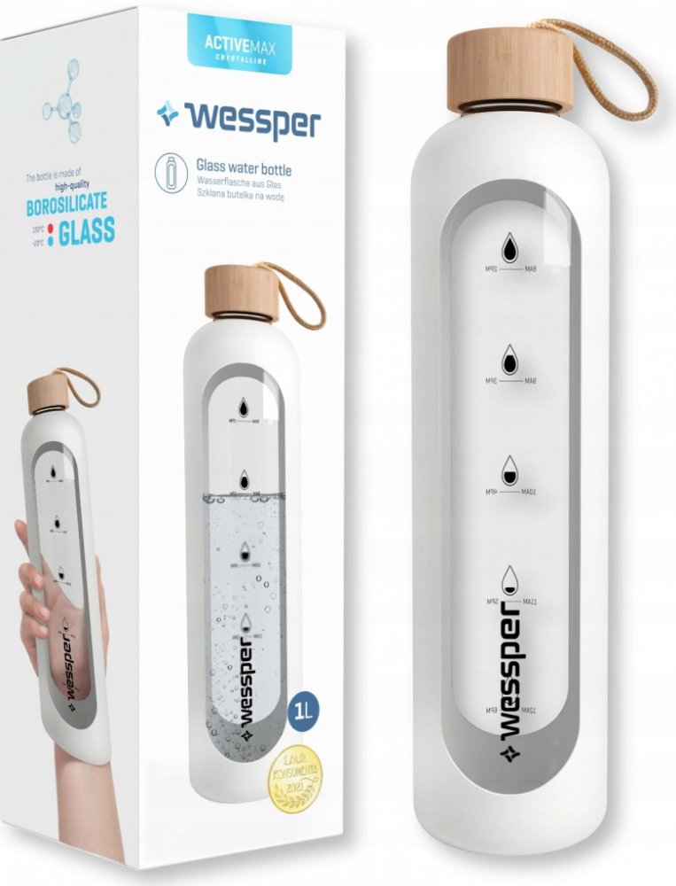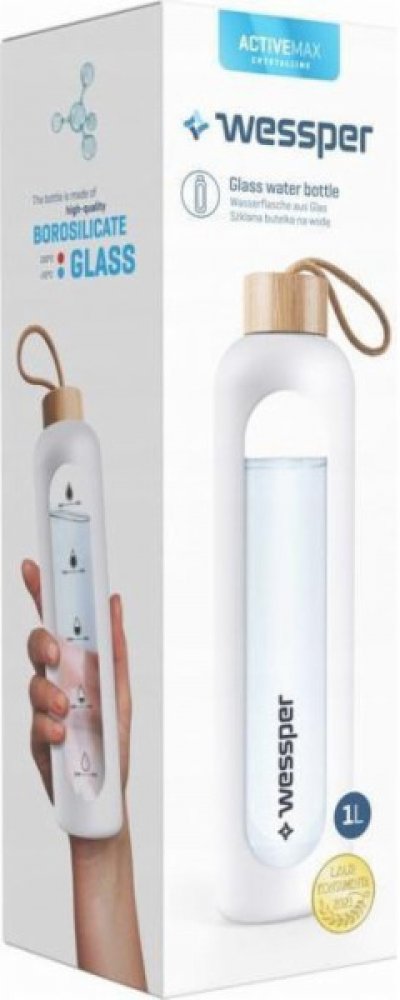 Skleněná láhev na pití Wessper se silikonovým obalem, láhev na vodu s ukazateli času, průhledná láhev na vodu z borosilikátového skla, sledování denního příjmu vody 1 l - bíláO této položce : Skleněná láhev na vodu Wessper má objem 1000 ml, je vhodná pro venkovní i vnitřní použití. Pro přidávání ledu, přípravu ovocných čajových nálevů a horkých studených nápojů.̈ : Láhev na vodu vyrobená z vysoce kvalitního borosilikátového skla. Díky svým vlastnostem je obzvláště odolné proti rozbití a poškrábání. Silikonové pouzdro zajišťuje pevné uchopení. : Láhev je vybavena stupnicí, která uživateli připomíná pravidelný příjem tekutin Dvojím naplněním láhve a vypitím celého obsahu je splněna denní potřeba vody. ̈: Speciální sklo odolává teplotám od -20 °C do 150 °C. Při nalévání velmi studeného nebo horkého nápoje se nemusíte obávat poškození láhve. : S vysoce kvalitním potravinářským těsnicím kroužkem, který neplesniví jako běžné láhve na vodu. Bambusový uzávěr podtrhuje moderní design. Láhev na vodu z vysoce kvalitního borosilikátového skla.Kromě jedinečné funkce připomínající hydrataci si můžete být jisti také její vysokou kvalitou.Vyrobeno z borosilikátového sklaBez škodlivého BPA!Bez chemického zápachu a chutiOdolné vůči extrémním teplotám od -20 do 150 °CŽádný únikLáhev pojme až 1000 ml, takže máte přístup ke své oblíbené vodě po celé hodiny, aniž byste ji museli doplňovat!Rozměry:Objem: 1 litr,Výška 295 mm,Průměr 80 mm.Jak funguje?Díky motivační stupnici láhev ukazuje, zda jste za den vypili dostatek vody. Stačí ji naplnit dvakrát, abyste dosáhli cílové hodnoty 2 litry!Díky kapacitě až 1 000 ml nemusíte láhev často doplňovat. Pokud ji naplníte dvakrát, budete mít zásobu vody na celý den.Vlastnosti: Vhodná pro všechny, kteří chtějí používat vodu:Lahvička Wessper ActiveMax Crystalline Incentive je vhodná nejen na vodu, ale i na další nápoje.Snadno odolá teplotám od -20 do 150 °C.Můžete ji také mýt v myčce nádobí
