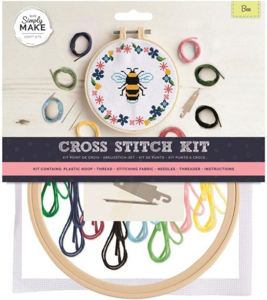 Praktická sada Simply Make Cross Stitch Kit Bee, kde je vše na vyšívání obrázku včetně plastového vyšívacího rámečku. Sada obsahuje: plastový vyšívací kruh, 8 barev přízí na vyšívání, látka na vyšívání, 2 jehly, navlékač příze a návod včetně vyšívaného vzoru. Průměr vyšívacího kruhu cca 19cm. Varování: výrobek není hračka, pouze na dekorativní účely. Hořlavý. Chraňte před zdroji tepla a otevřeným ohněm. Nebezpečí udušení. Obsahuje malé části. Používejte prosím opatrně. Není vhodné pro děti do 12 let. Tento výrobek obsahuje funkční ostré hrany, používejte pod dohledem dospělých. Barvy a obsah se mohou lišit.